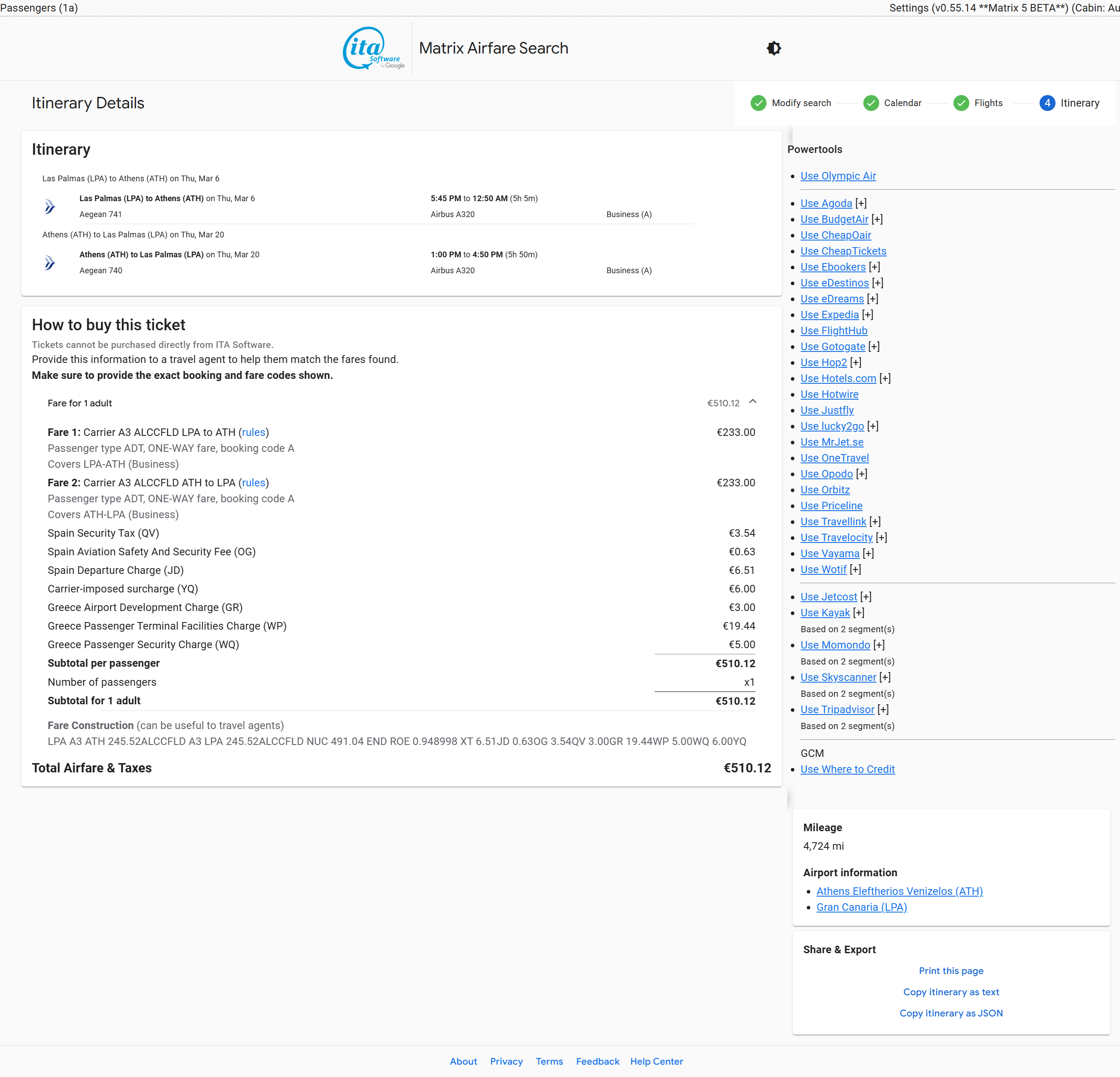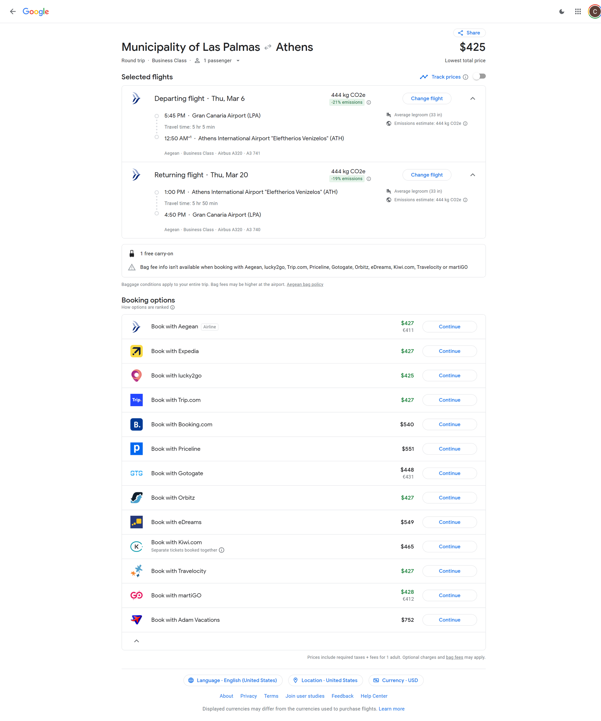 A3 - Las Palmas (LPA) to Athens (ATH) - 411 EUR / $427 USD Roundtrip - Business