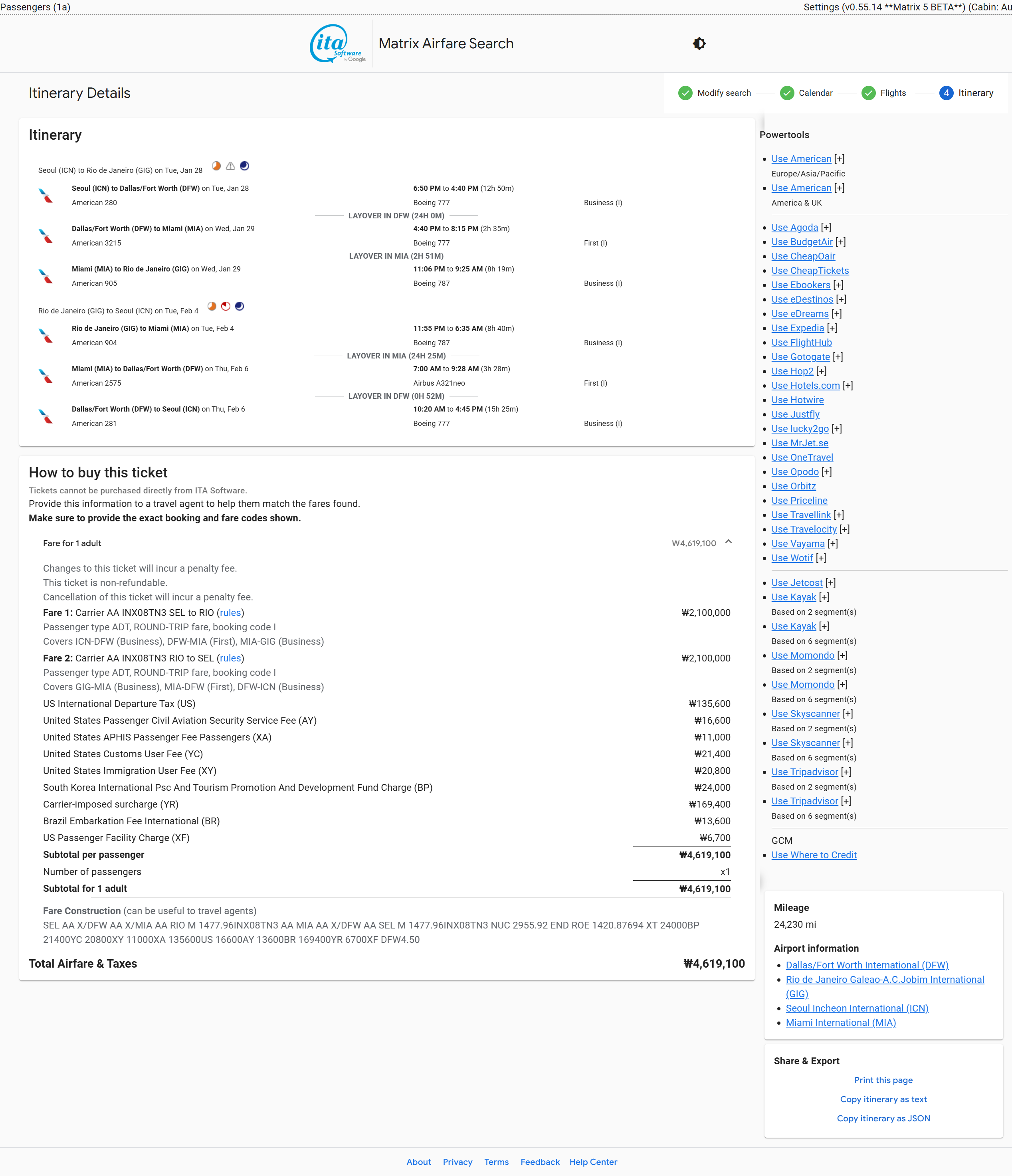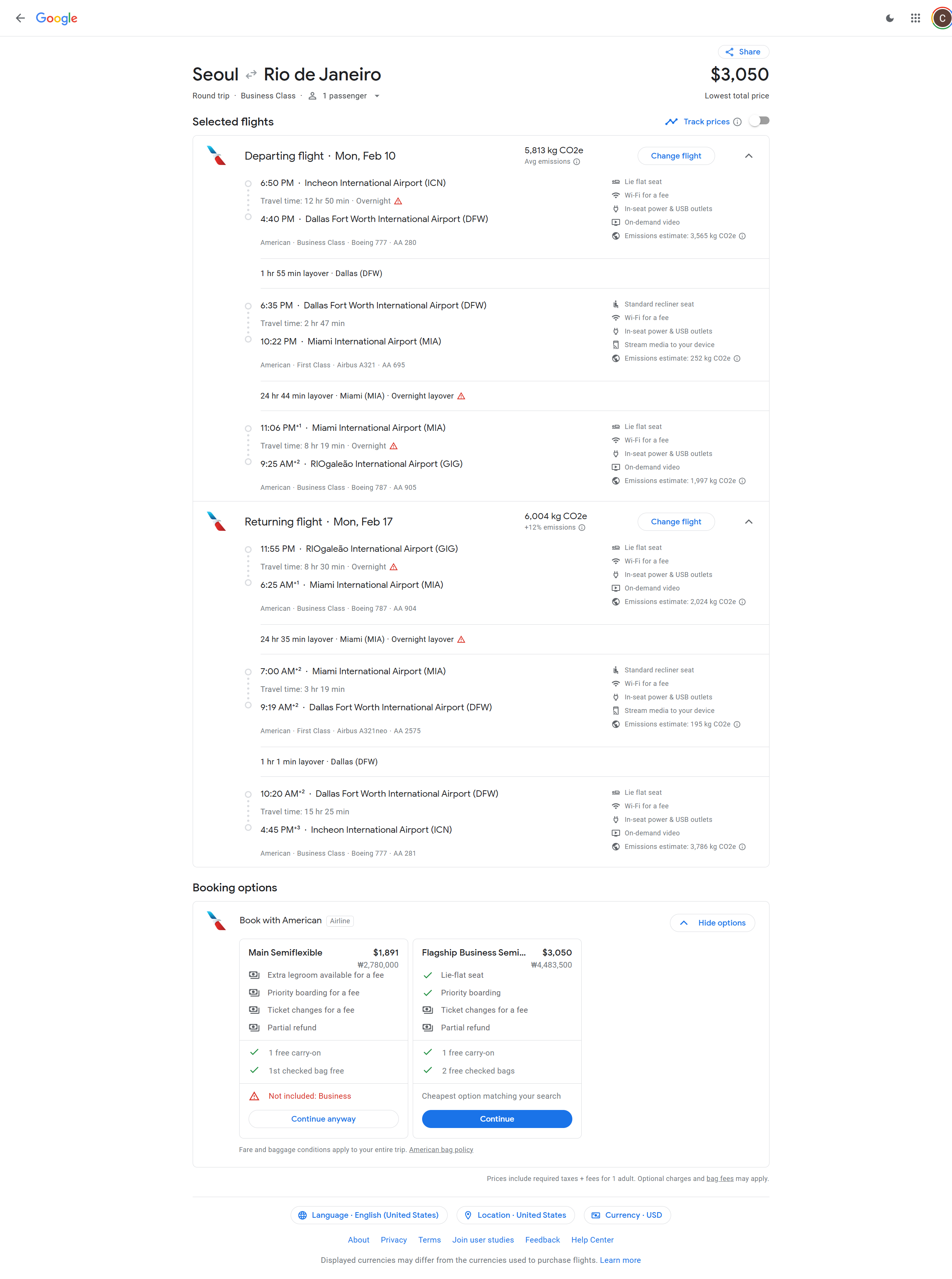 AA - Seoul (ICN) to Rio de Janeiro (GIG) - 4483500 KRW / $3050 USD Roundtrip - Business