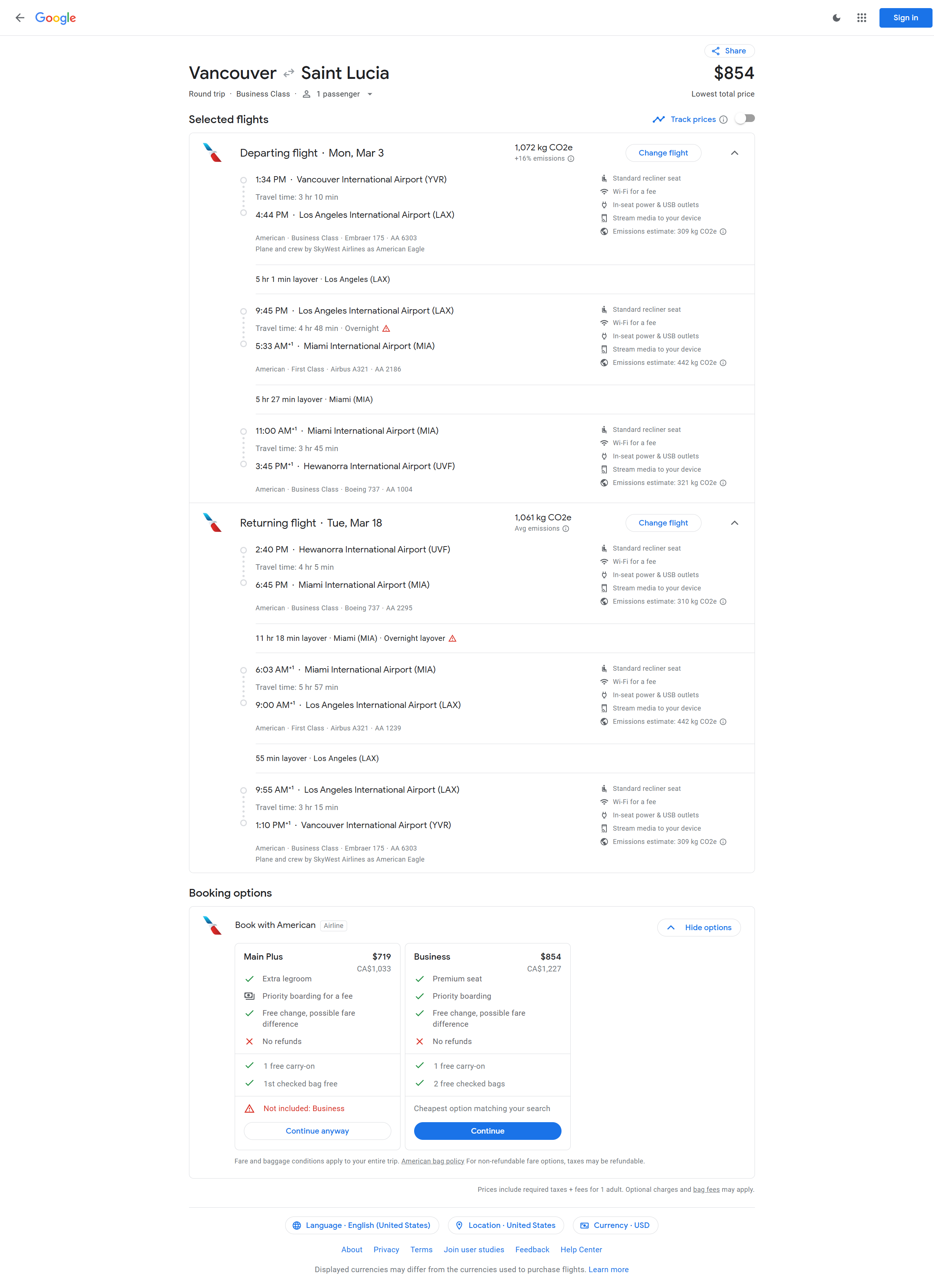 AA - Vancouver (YVR) to St Lucia (UVF) - $854 Roundtrip / $426 One-Way - Domestic First