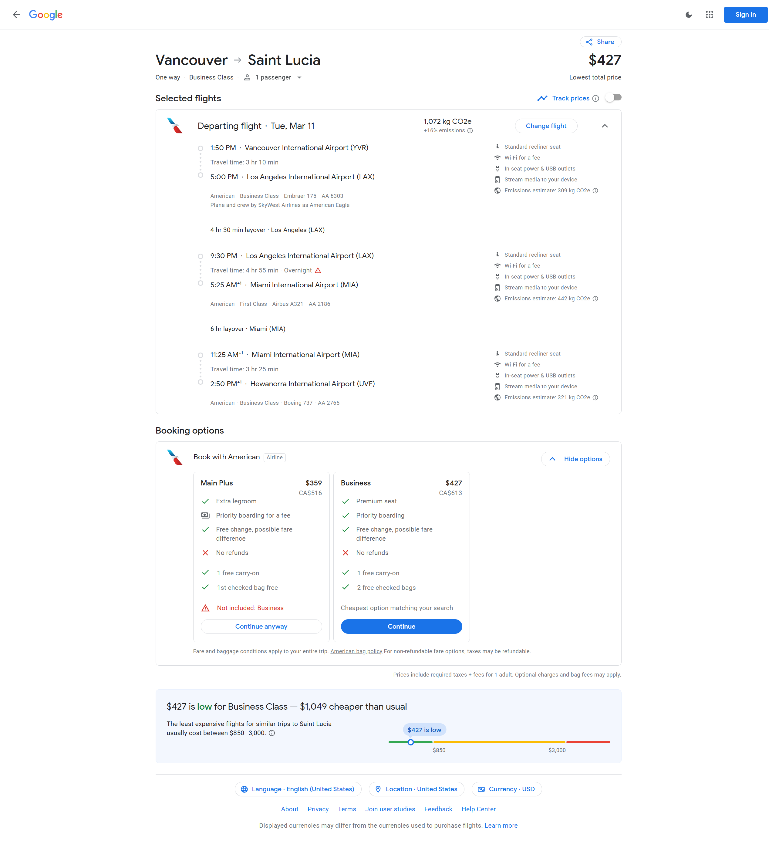 AA - Vancouver (YVR) to St Lucia (UVF) - $854 Roundtrip / $426 One-Way - Domestic First
