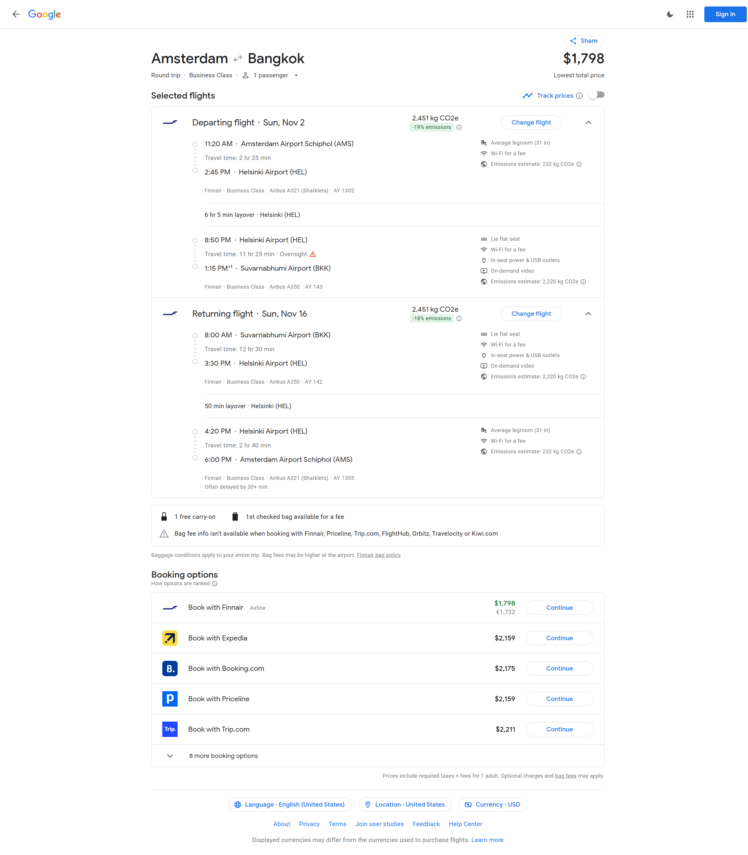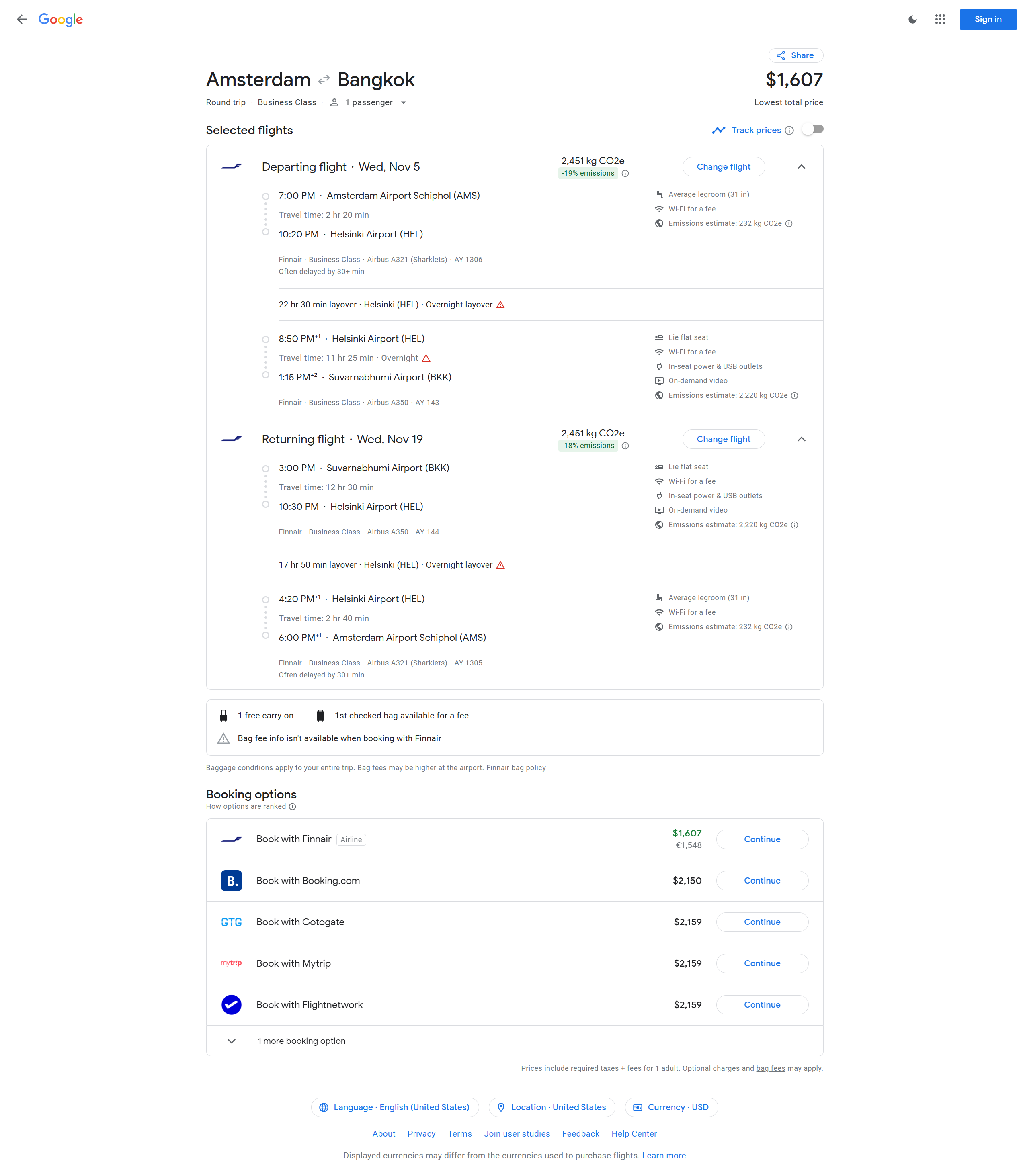 AY - Amsterdam (AMS) to Bangkok (BKK) - 1548 EUR / $1607 USD Roundtrip - Business