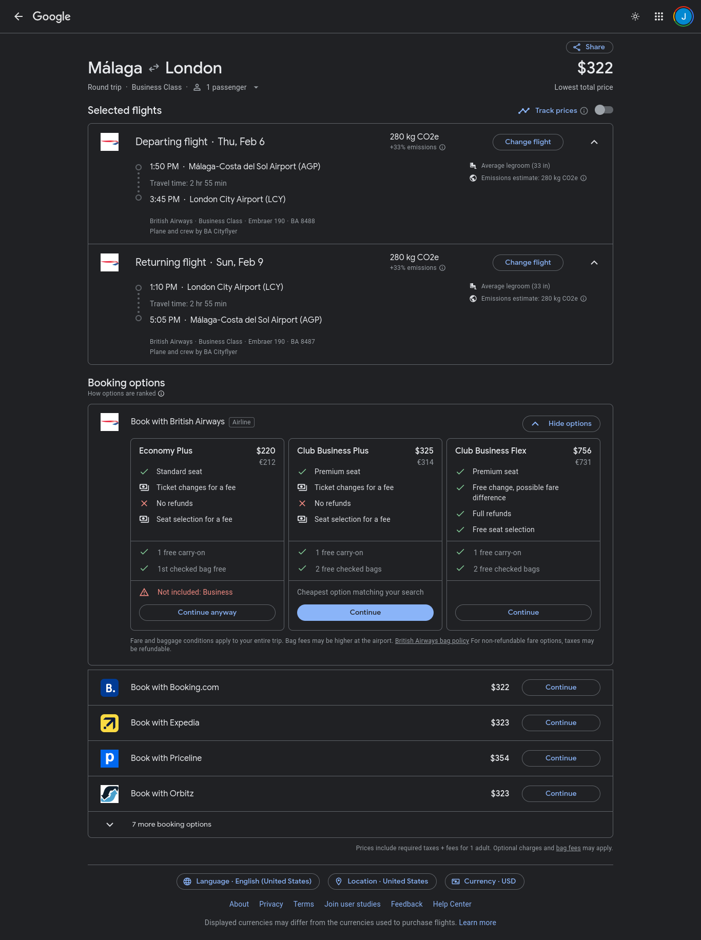 BA - Malaga (AGP) to London (LCY) - 314 EUR / $325 USD Roundtrip - Business