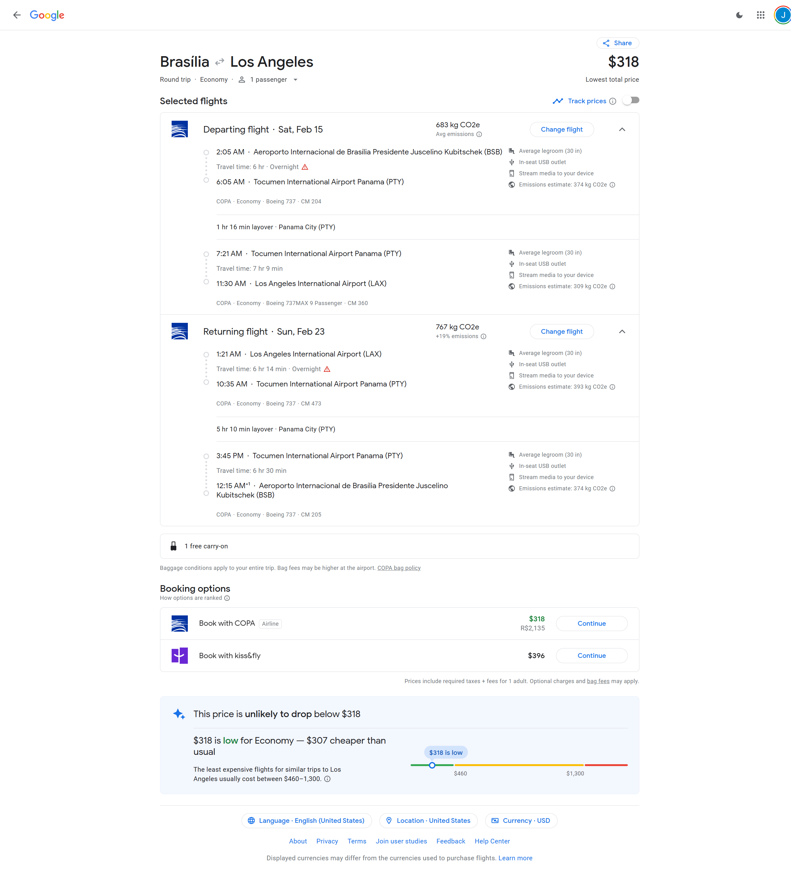 Copa - Brasilia, Brazil (BSB) to Los Angeles (LAX) - 2135 BRL / $318 USD roundtrip in economy.