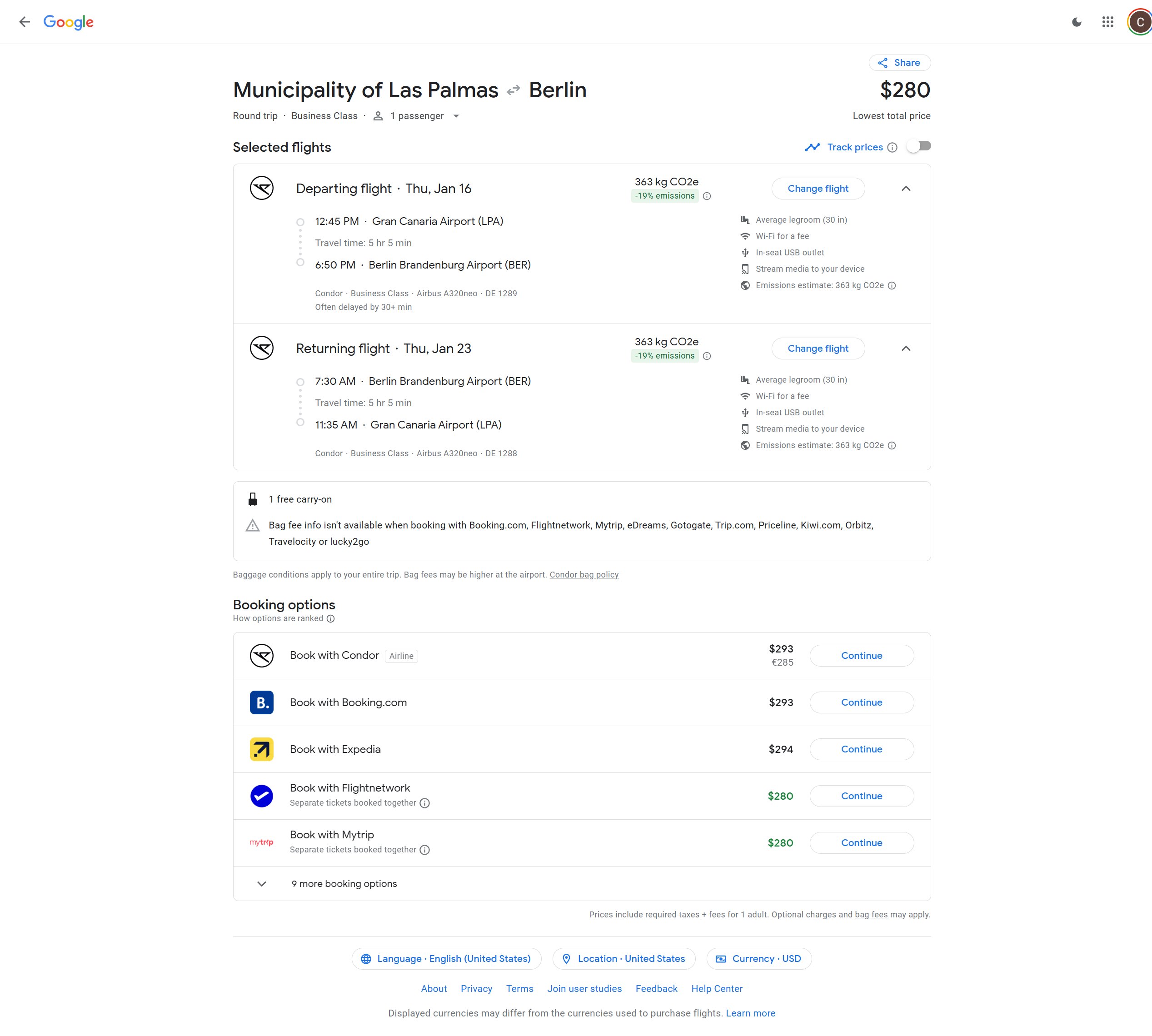 Condor - Las Palmas, Spain (LPA) to Berlin, Germany (BER) - 130 EUR / $134 USD one-way or 285 EUR / $293 USD roundtrip.