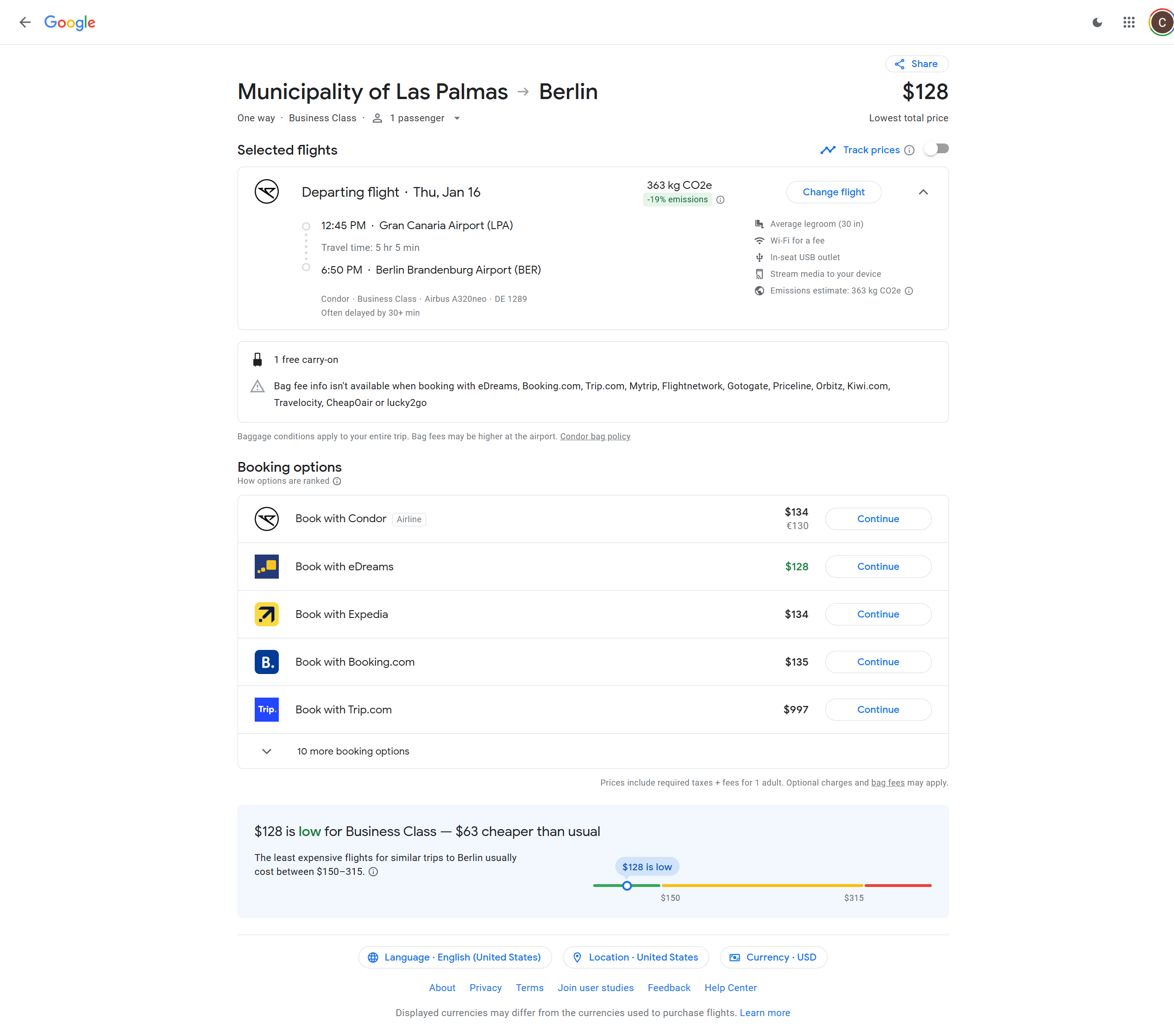 DE - Las Palmas (LPA) to Berlin (BER) - 130 EUR / $134 USD One-Way or $293 USD Roundtrip - Business