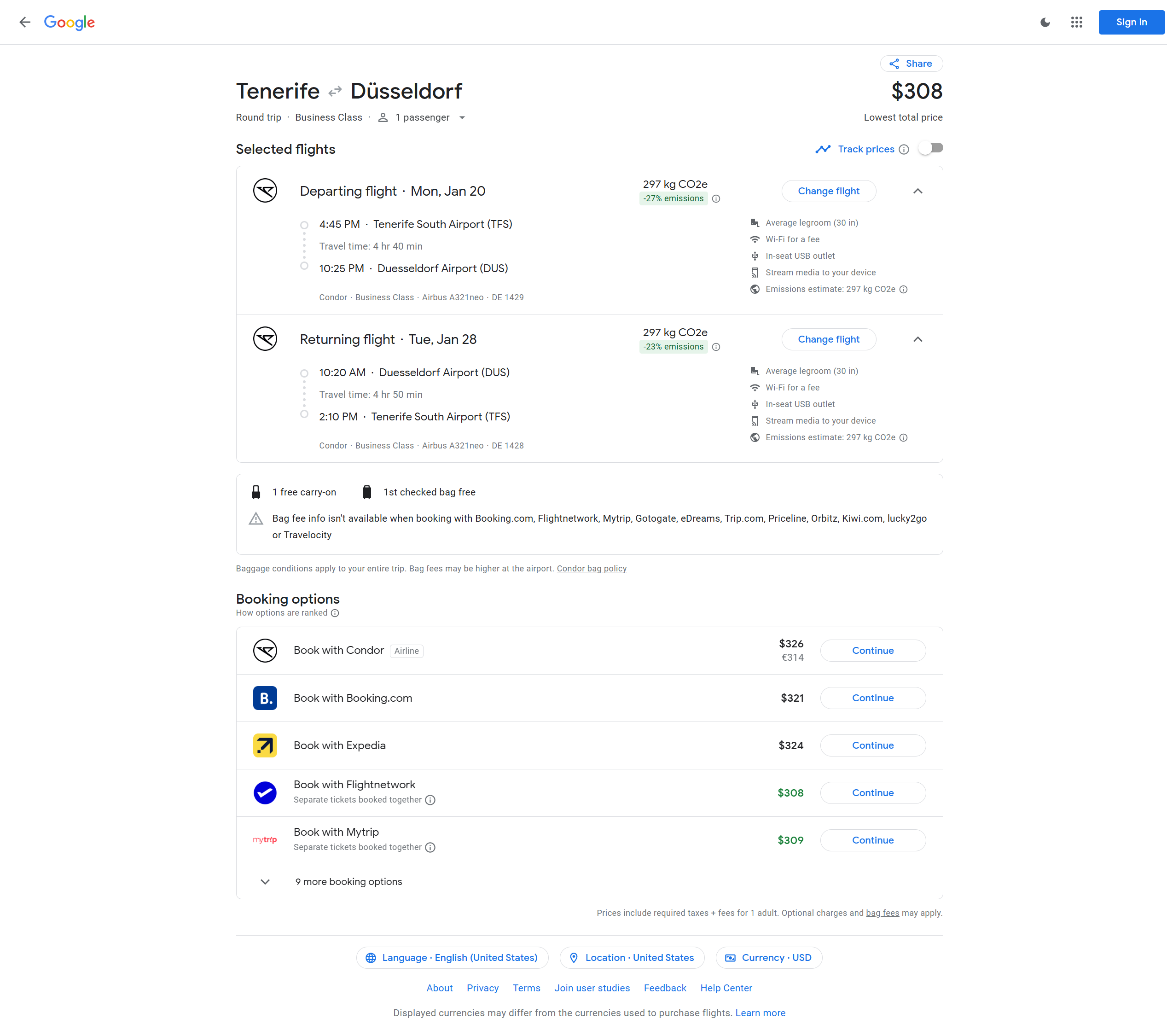 Condor - Tenerife (TFS) to Dusseldorf (DUS) - 314 EUR / $326 USD roundtrip in business (eurobiz).
