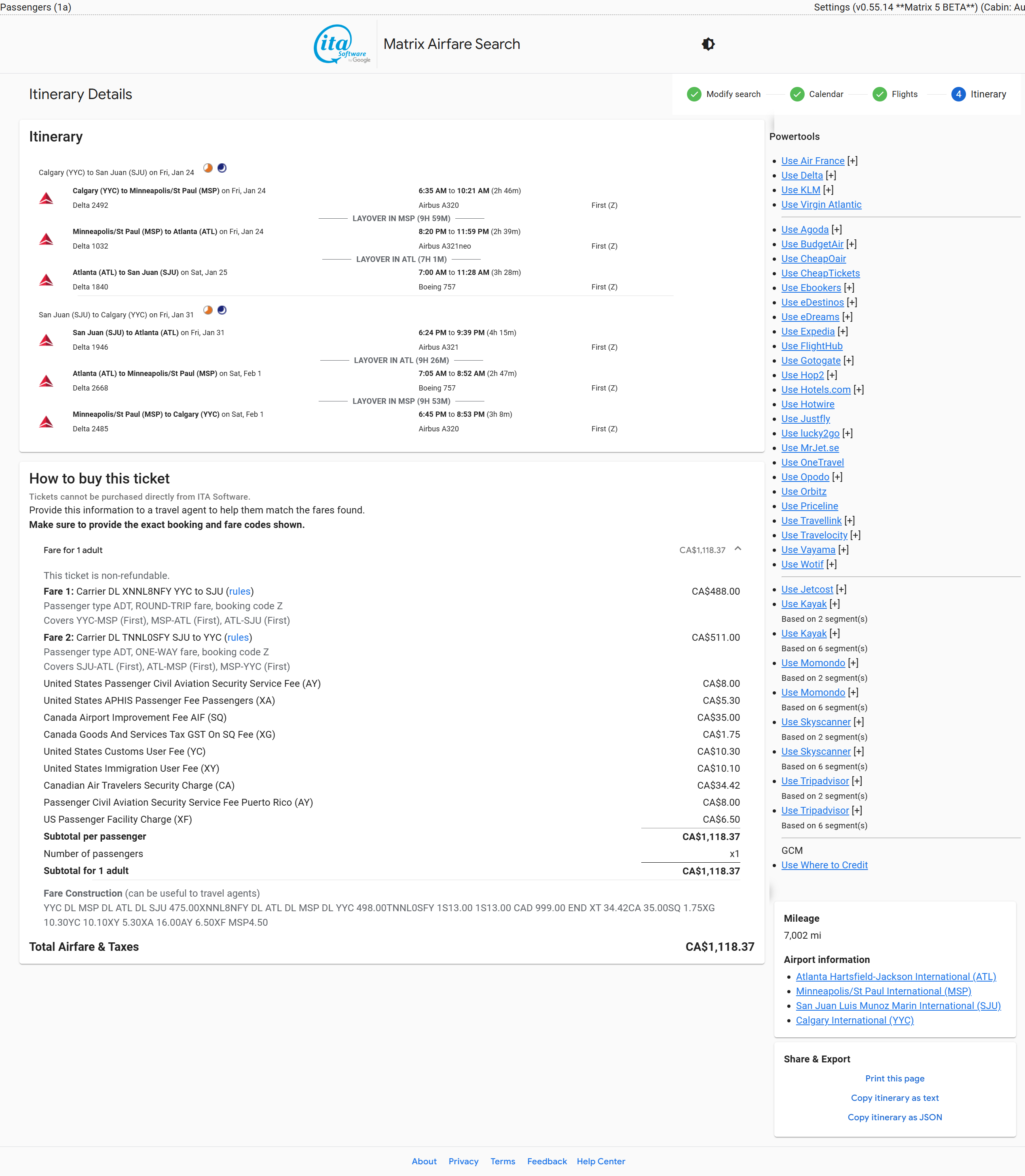 Flying Blue doesn't award XP for WestJet flights anymore. For a routing entirely operated by Delta - YYC-MSP-ATL-SJU-ATL-MSP-YYC / 7002 Miles / 10.5256 cpm USD