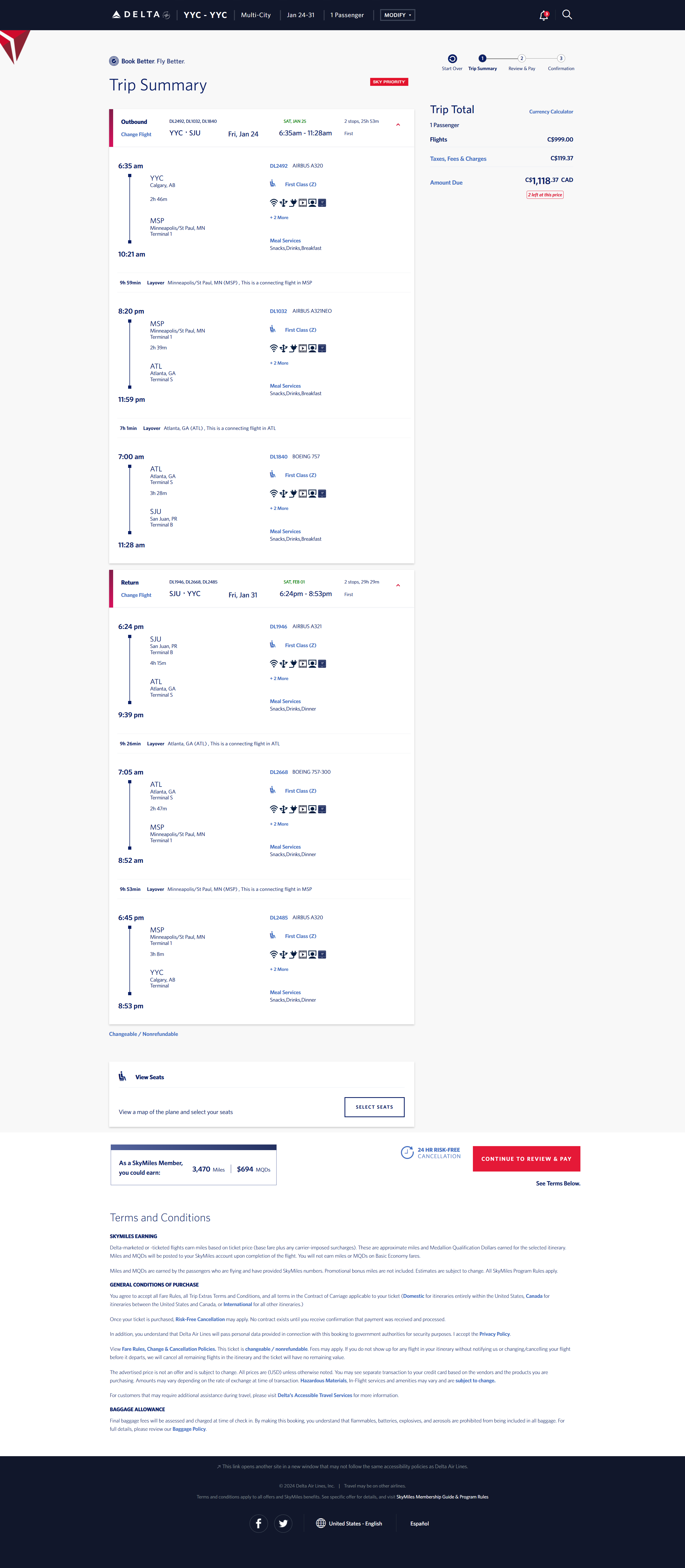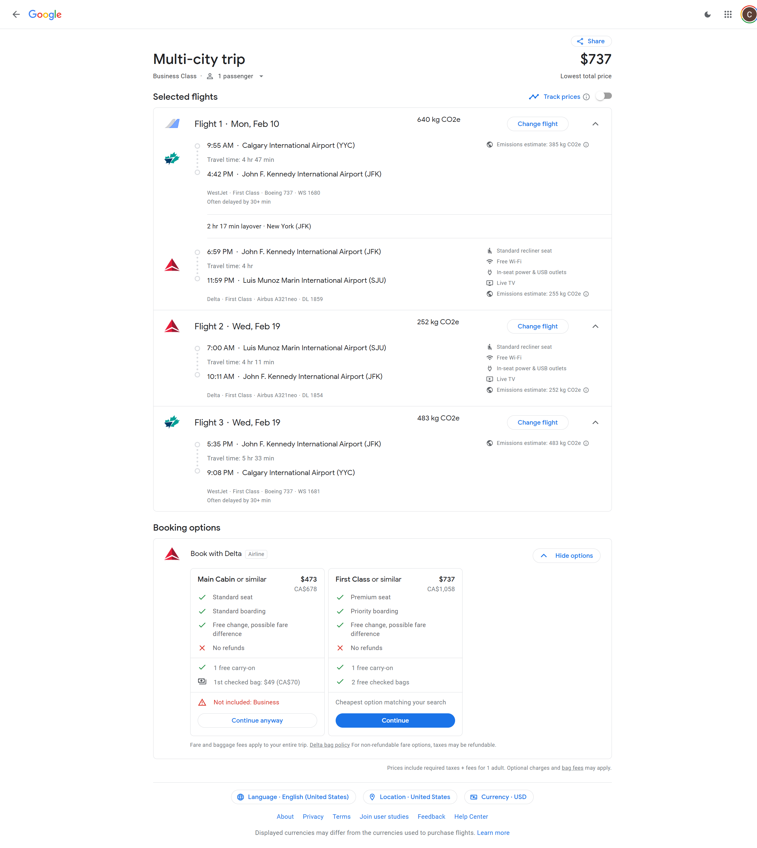 Delta Air Lines / WestJet - Calgary, Alberta, Canada (YYC) to San Juan (SJU) - 1058 CAD / $737 USD roundtrip in domestic first