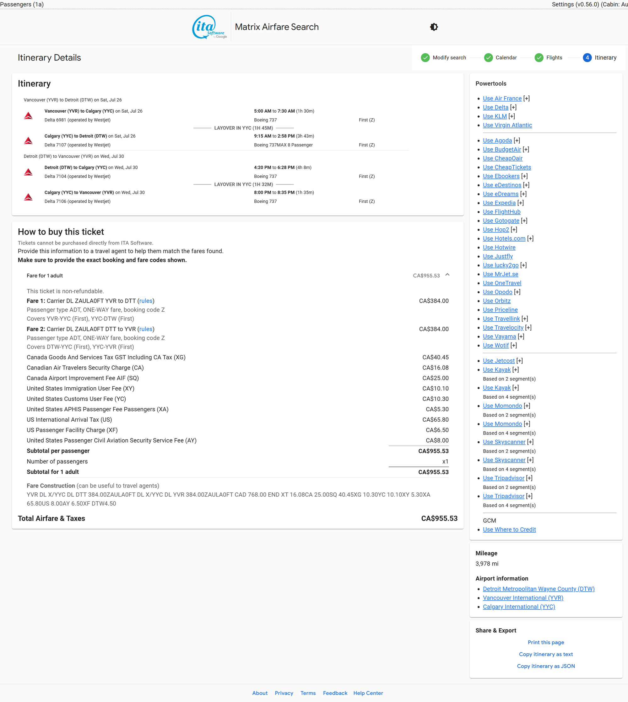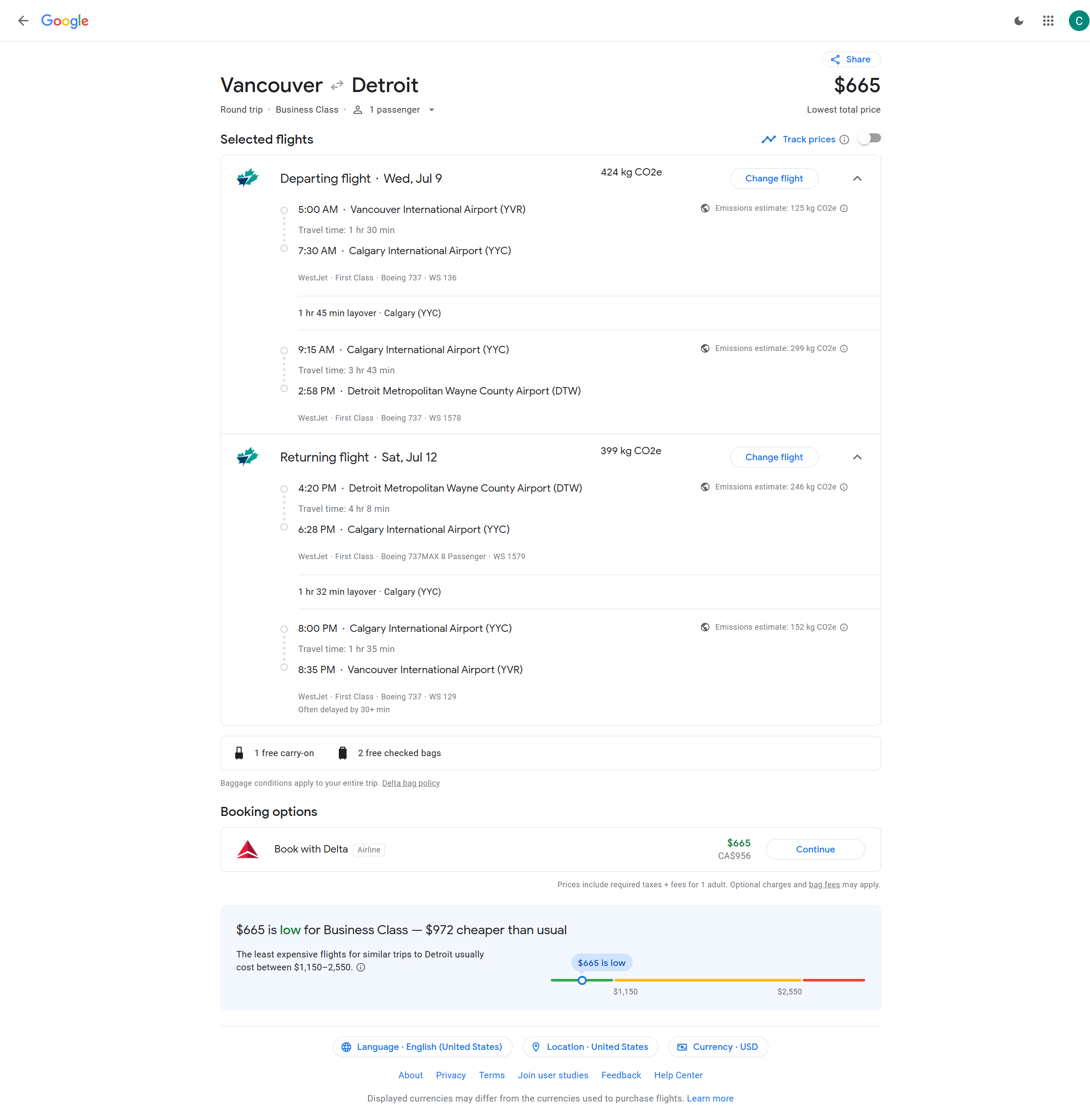 Delta fare operated by WestJet and Delta from Vancouver, Canada (YVR) to Detroit, USA (DTW) - 956 CAD / $665 USD roundtrip in domestic first.