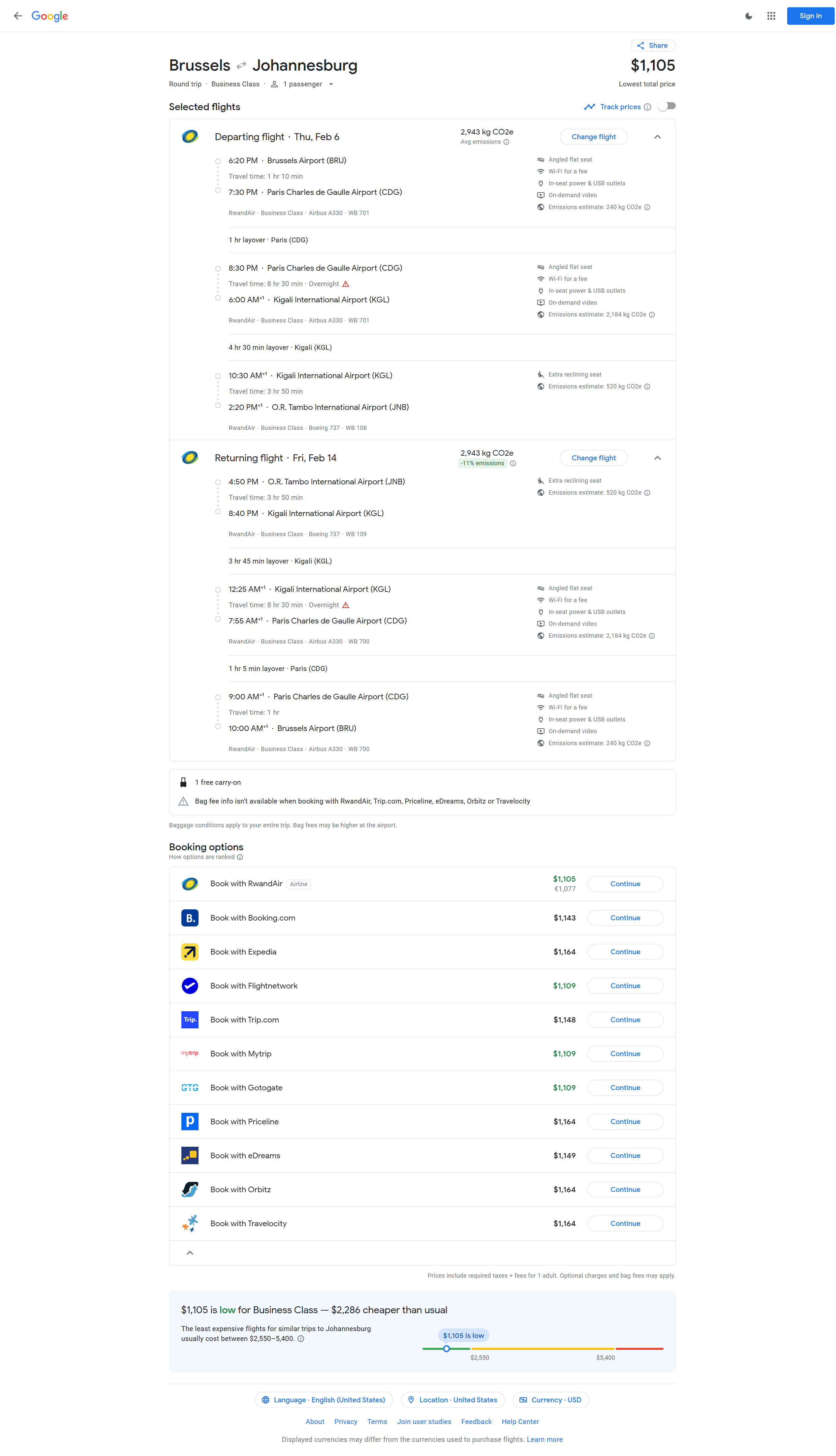 This is about a $900 discount over the usual, but not ideal since it looks like RwandAir has angle-flat seats in business.
