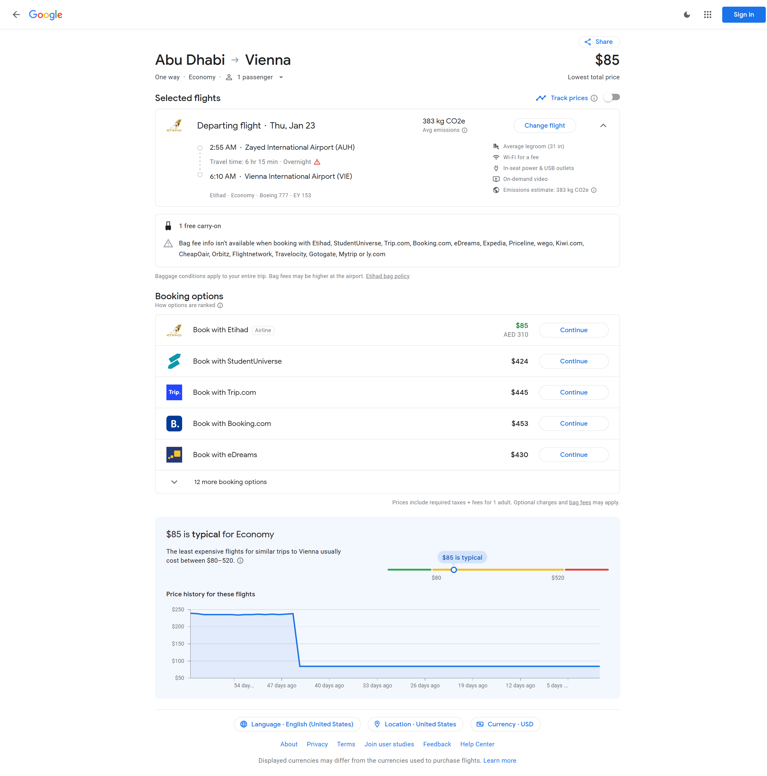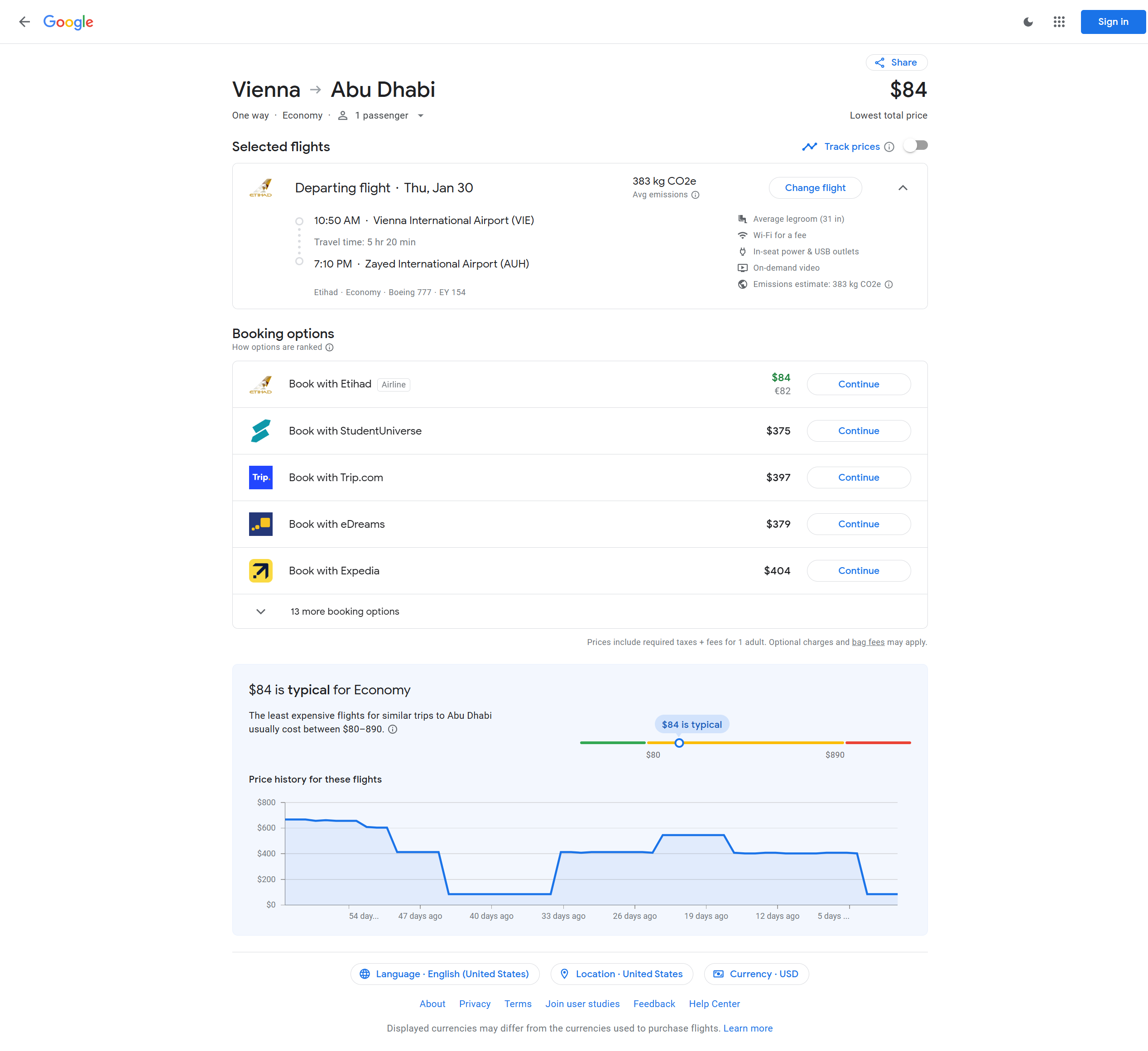 Etihad - Vienna, Austria (VIE) to Abu Dhabi, United Arab Emirates (AUH) or the reverse (AUH-VIE) - 82 EUR / 310 AED / $84 USD one-way in economy. If you want a roundtrip, buy two one-way tickets. An actual roundtrip is about $530 USD.