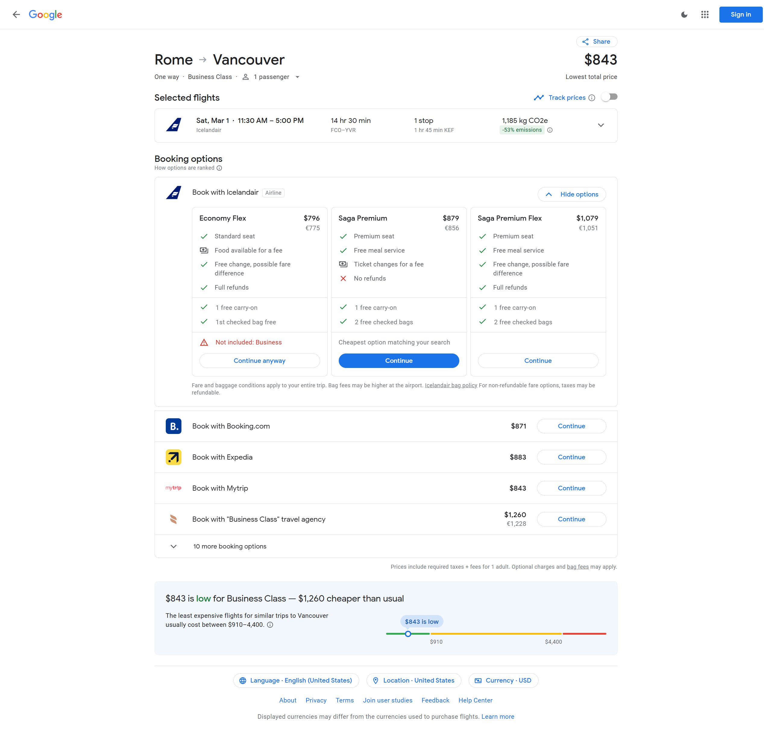 Icelandair just dropped the price to fly from Rome, Italy (FCO) to Vancouver, Canada (YVR) in Saga Class to 1402 EUR / $1439 USD roundtrip departing on Mar 1 and returning Mar 8, 2025.