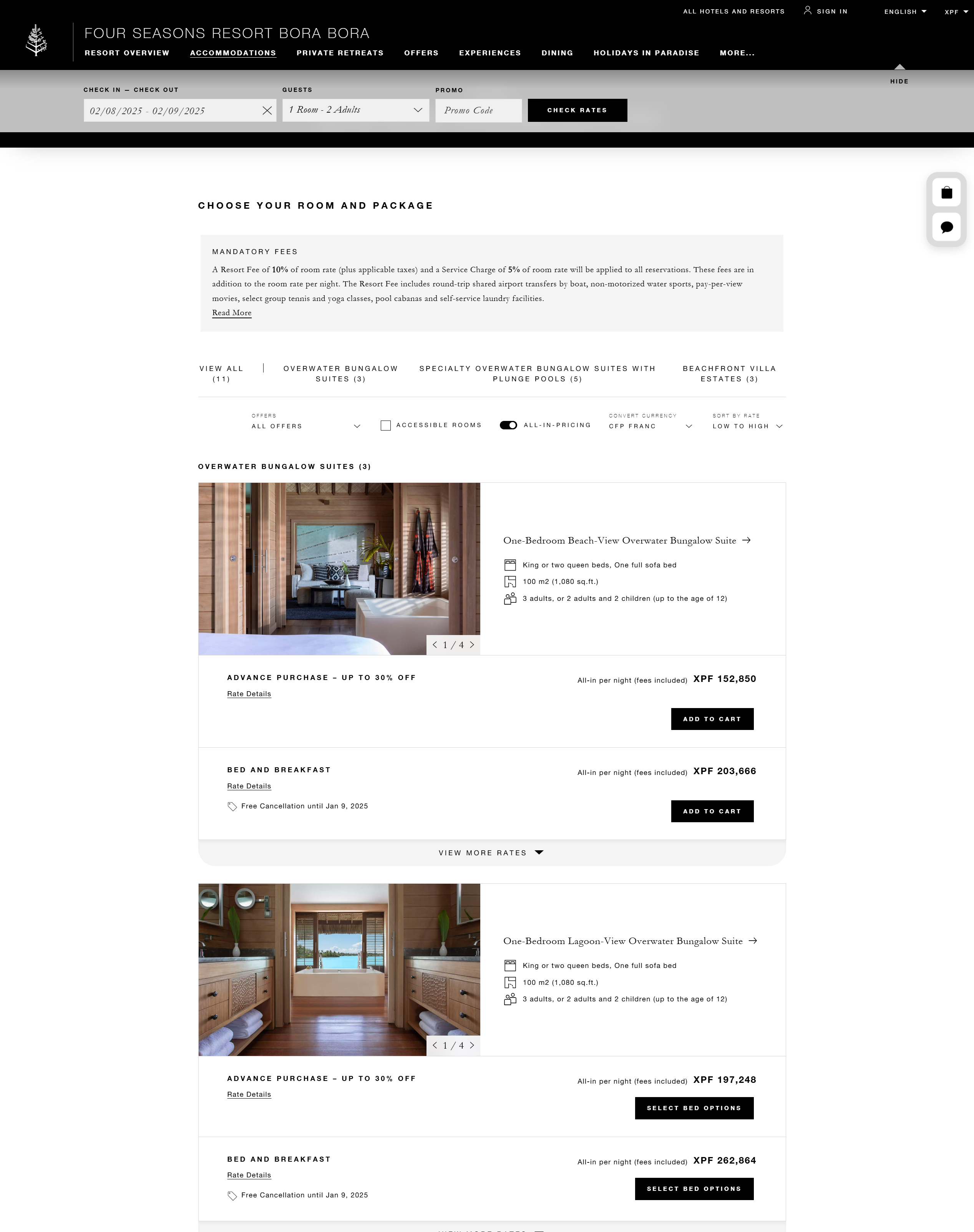 The Four Seasons Resort Bora Bora is 152,850 XPF or $1326 USD per night including taxes and fees the night of Feb 8 and Feb 9.