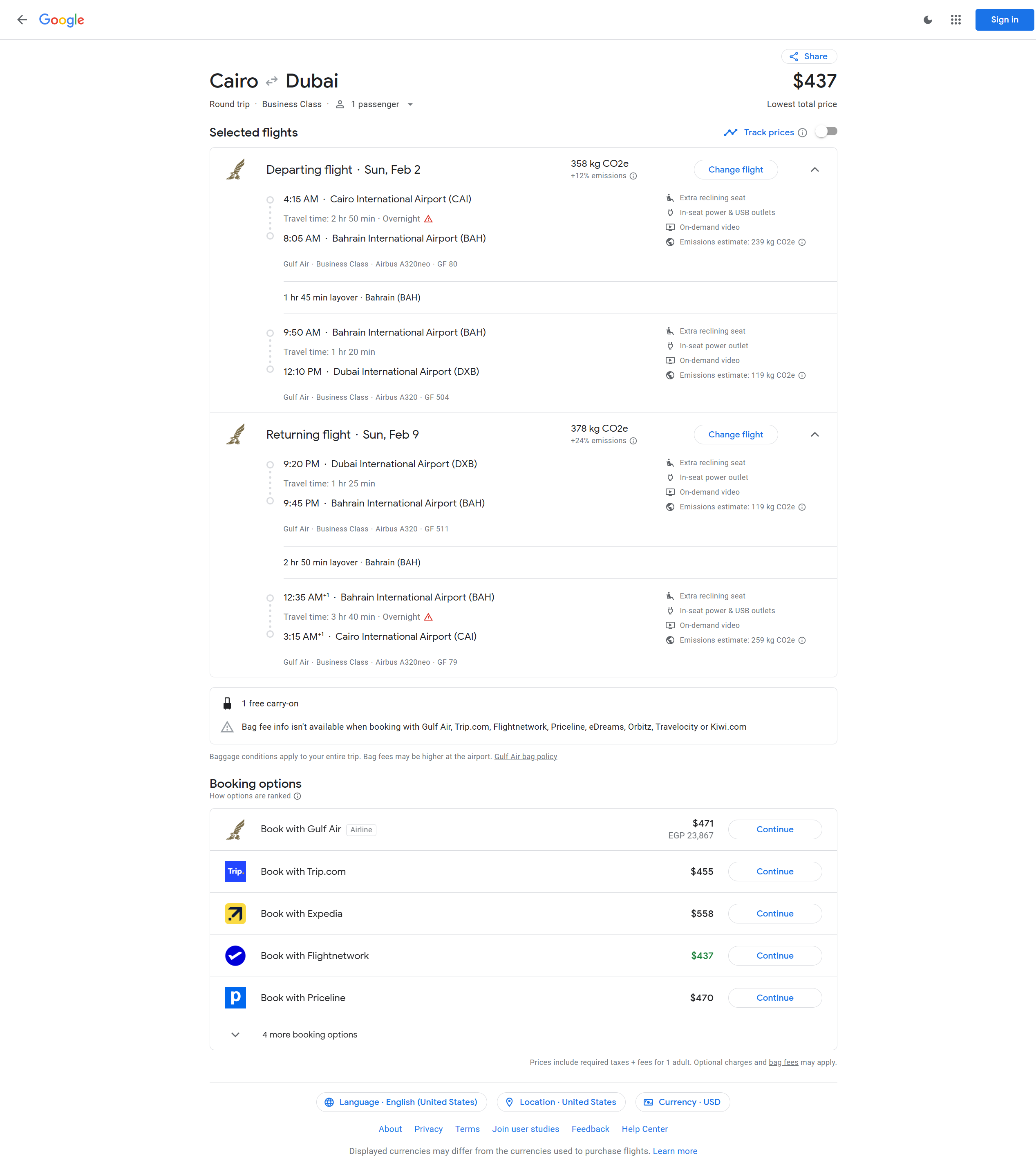 Gulf Air - Cairo, Egypt (CAI) to Dubai, United Arab Emirates (DXB / AUH) - 23867 EGP / $471 USD roundtrip in business.