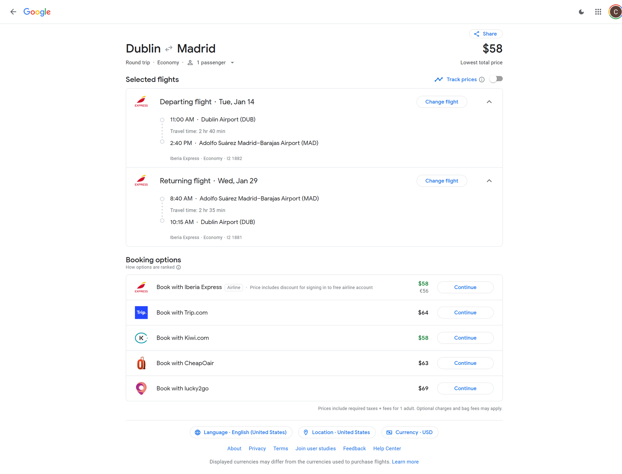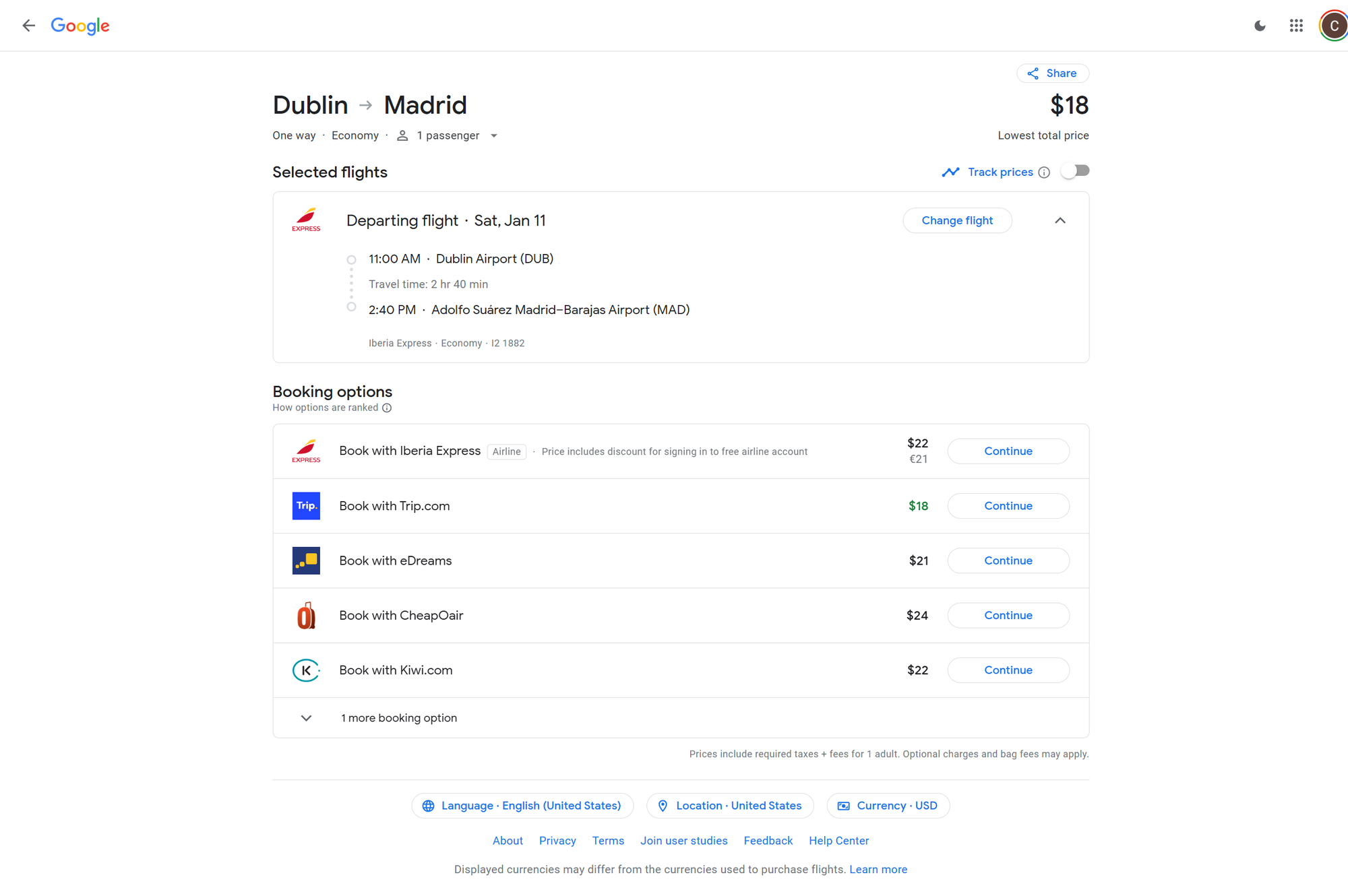 Iberia - Dublin, Ireland (DUB) to Madrid, Spain (MAD) - 21 EUR / $22 USD one-way or 56 EUR / $58 USD roundtrip
