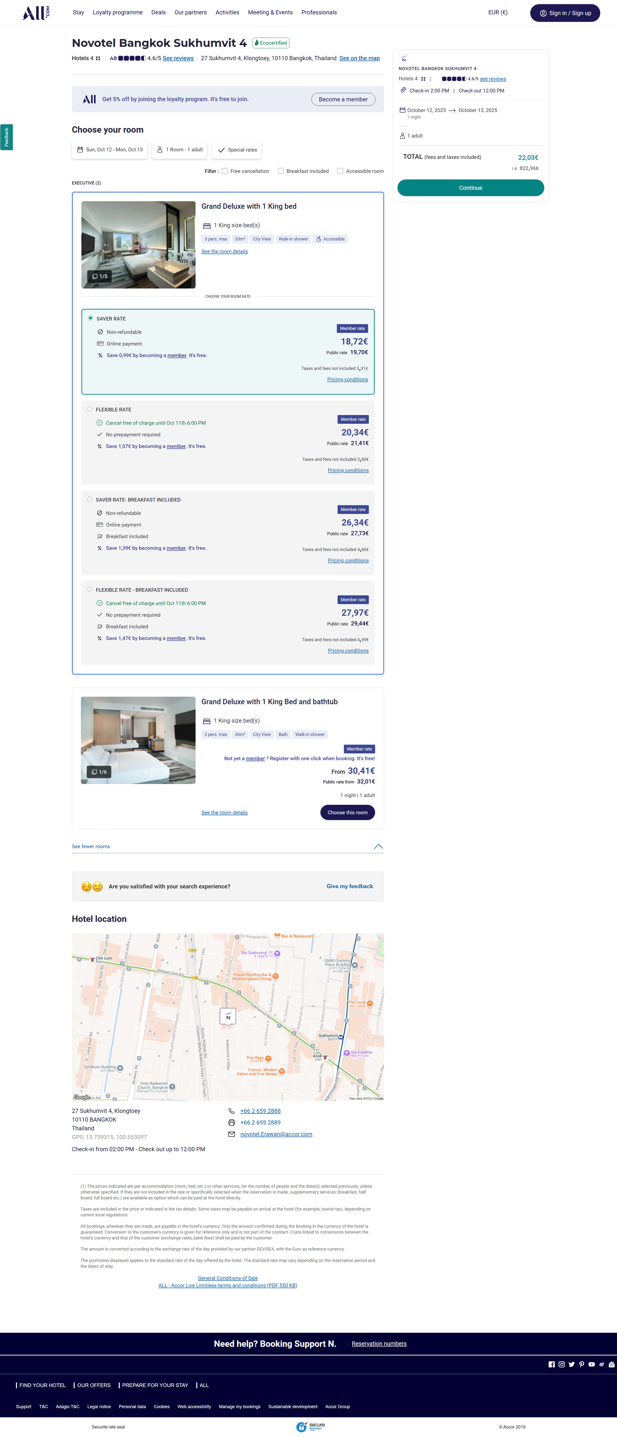 Single night error rate at the Novotel Bangkok Sukhumvit 4 in Bangkok, Thailand! Book Saturday October 21, 2025 to October 22, 2025 for 822.96 THB / 22.03 EUR / $25.87 USD for the night. If you're interested in breakfast you can get a rate that includes breakfast for 1158.40 THB / 31.01 EUR / $36.60 USD.