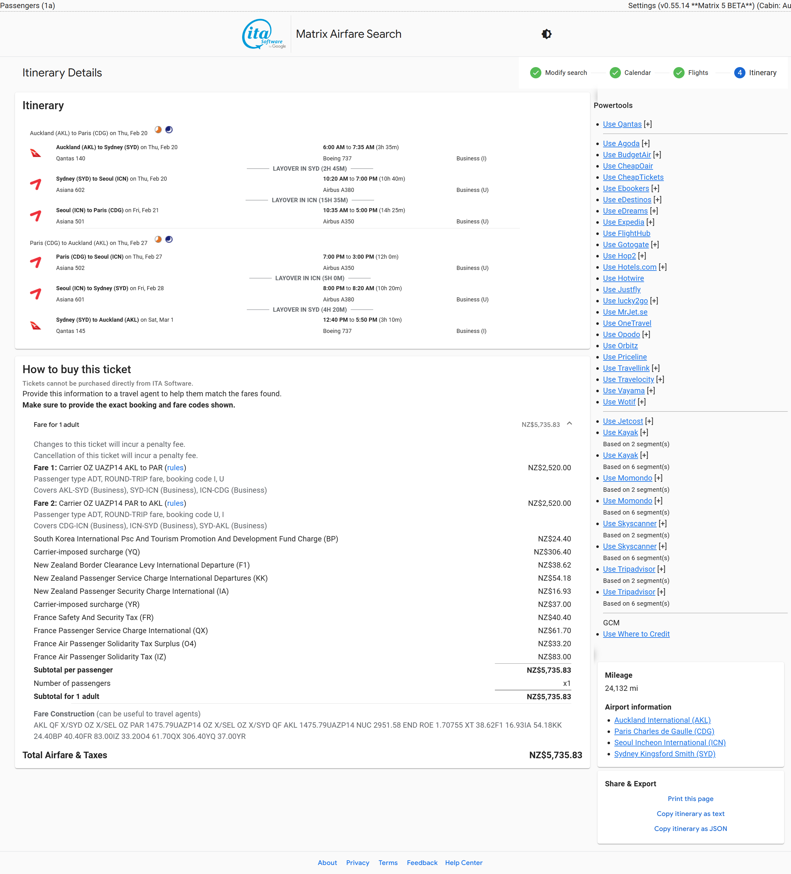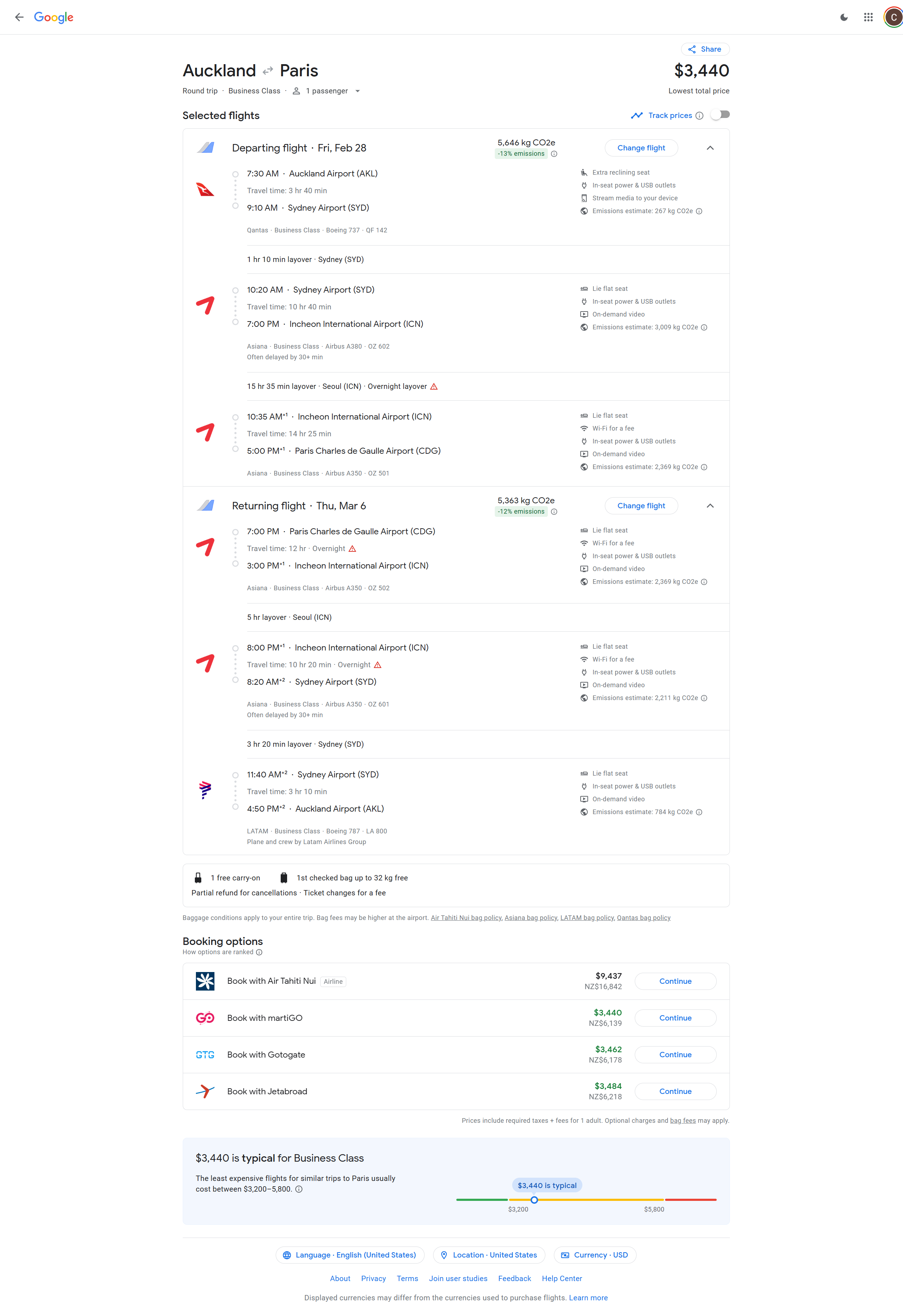 Asiana fare operated by Asiana, Qantas, Air New Zealand, and LATAM - Auckland, New Zealand (AKL) to Paris, France (CDG) - 5736 NZD / $3216 USD roundtrip in business.