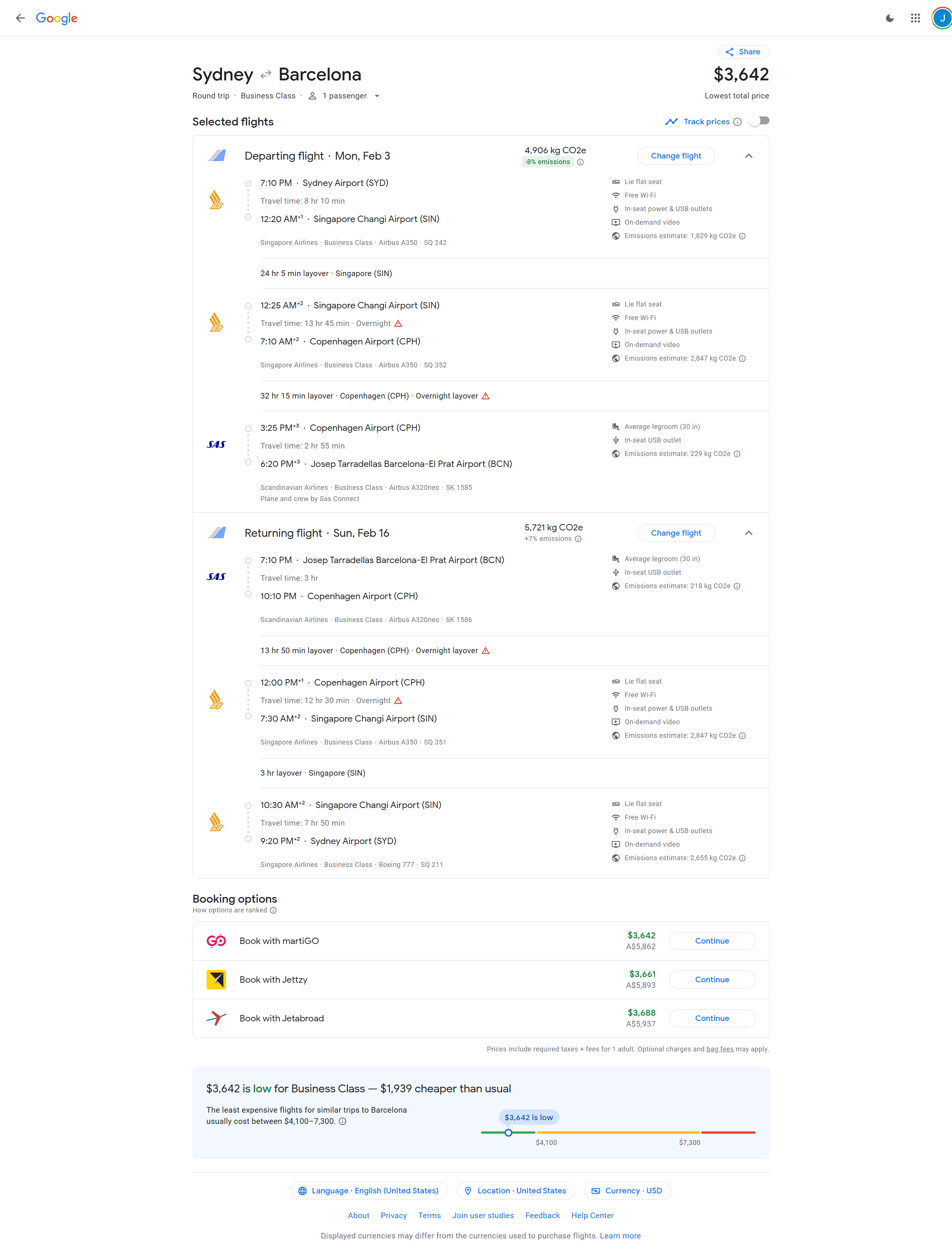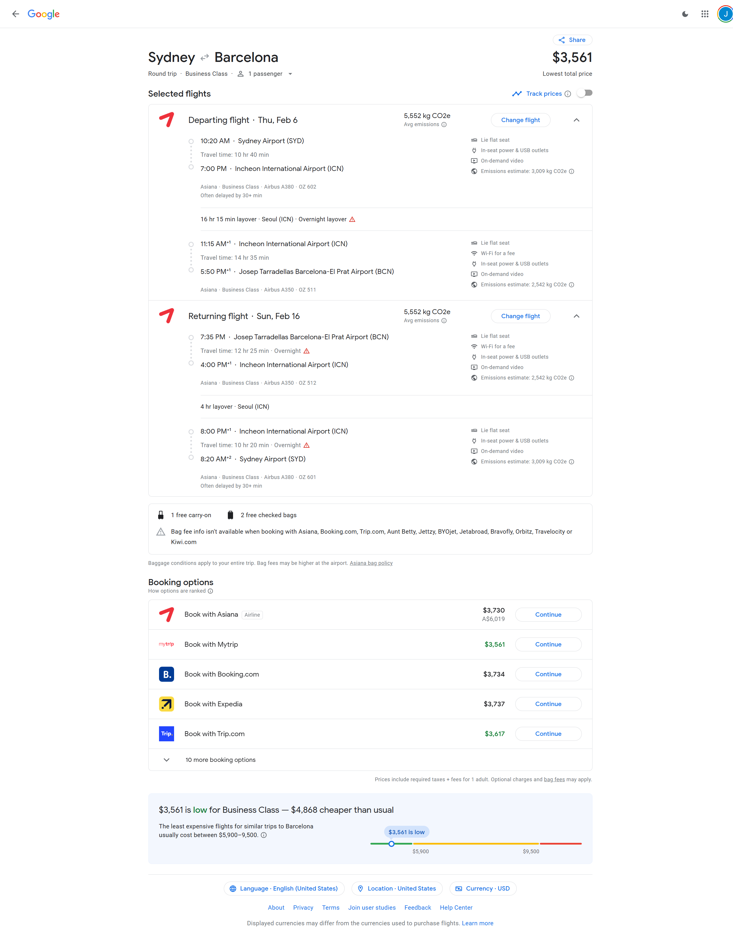 Feb 3, 2025 - Sydney, Australia (SYD) to Barcelona, Spain (BCN) - 5870 AUD / $3649 USD Roundtrip
