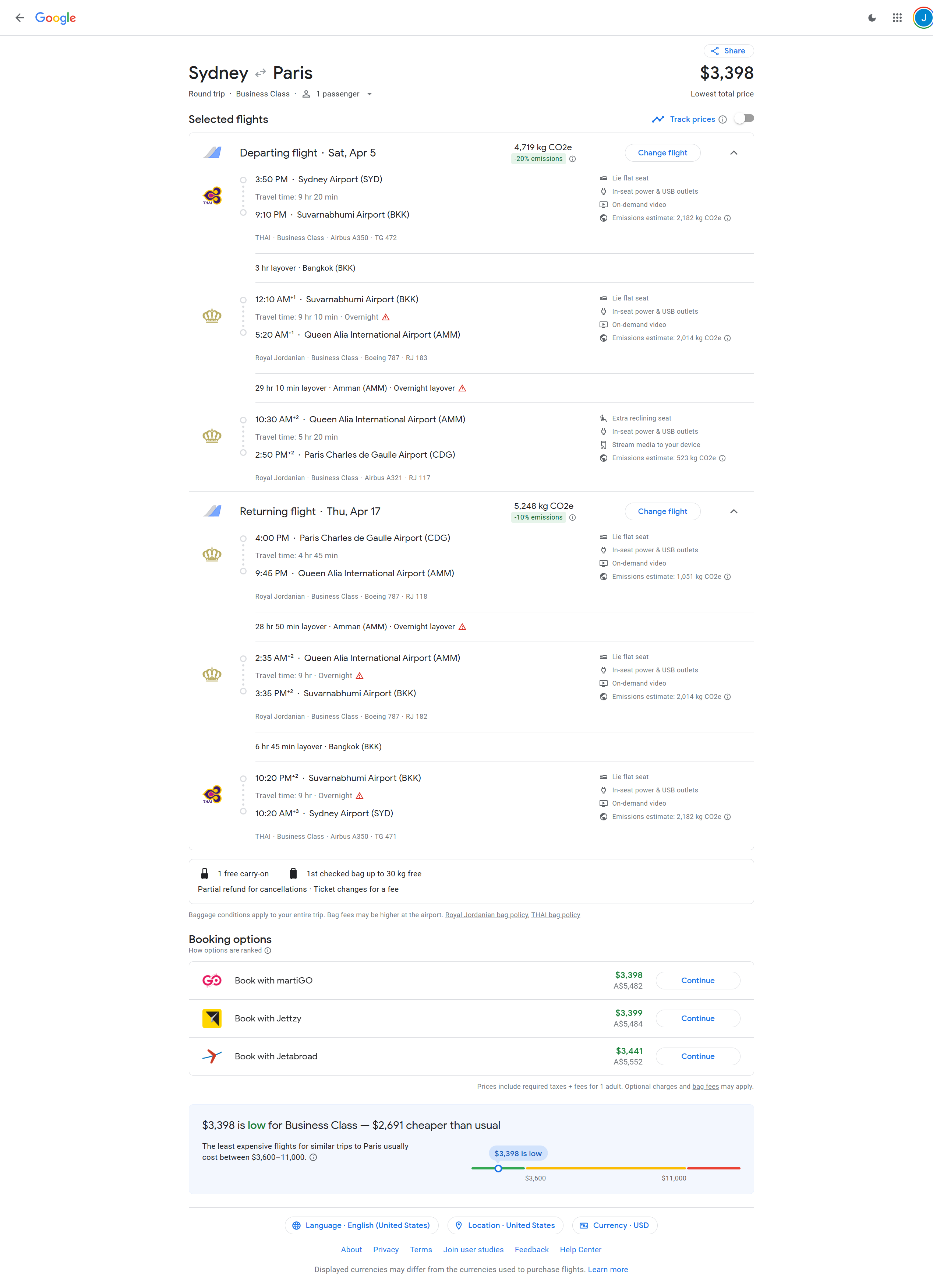 Apr 4, 2025 - Sydney, Australia (SYD) to Paris, France (CDG) - 5523 AUD / $3434 USD Roundtrip