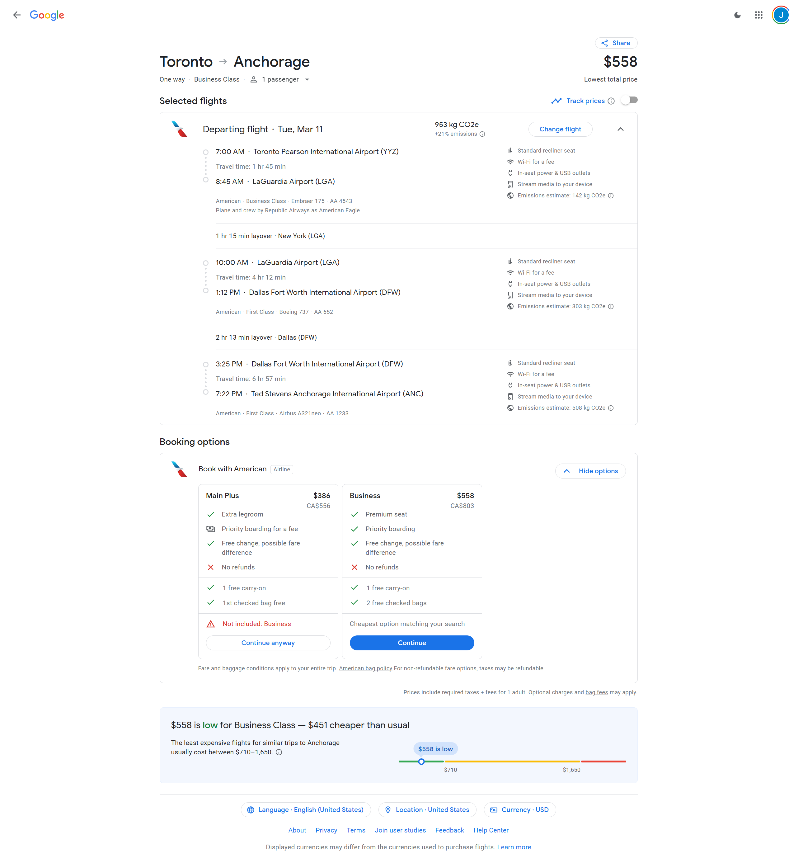 Mar 11, 2025 - Toronto, Canada (YYZ) to Anchorage, Alaska (ANC) - 803 CAD / $558 USD One-Way