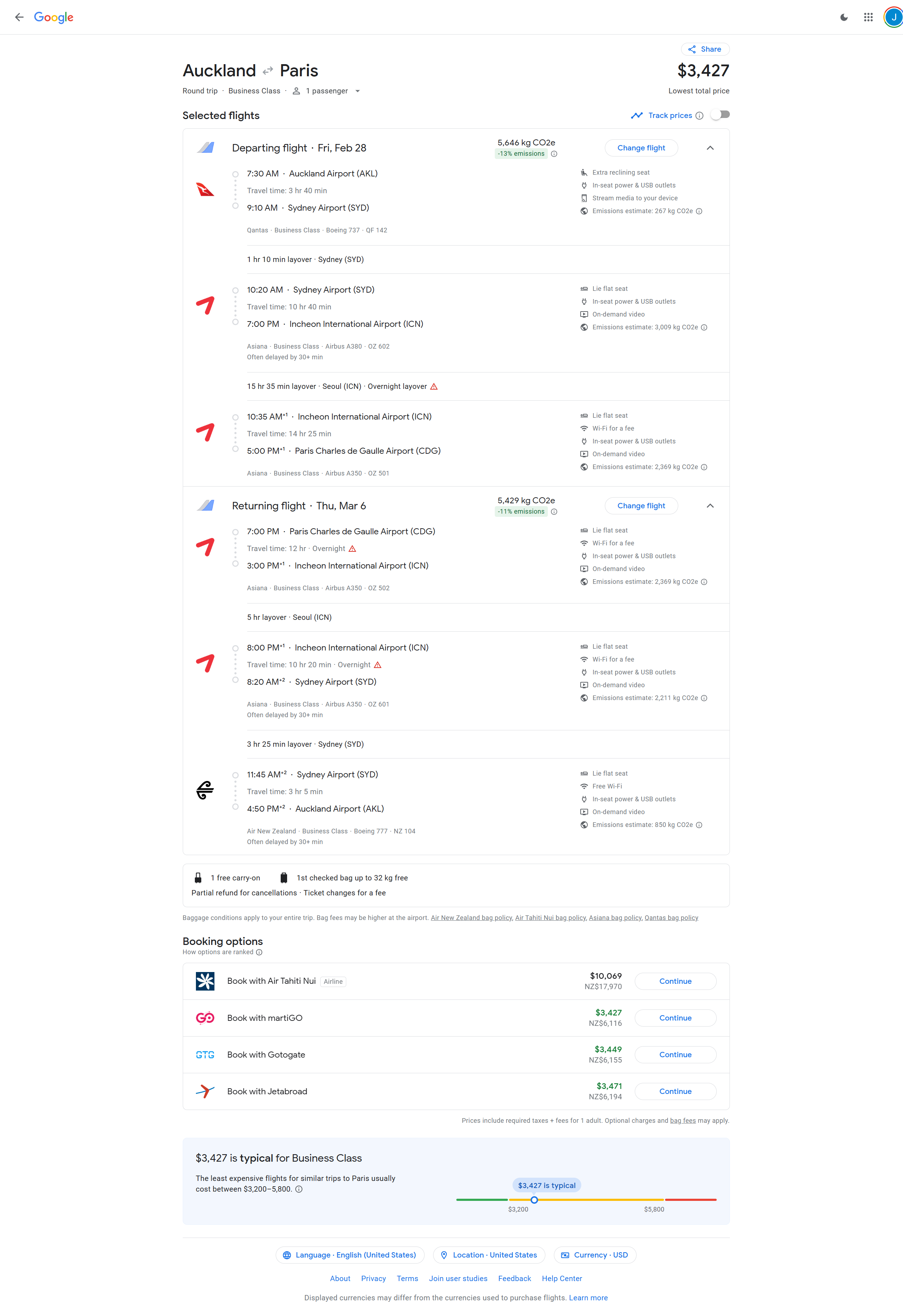 Feb 28, 2025 - Auckland, New Zealand (AKL) to Paris, France (CDG) - 6100 NZD / $3427 USD Roundtrip (multiple return options)