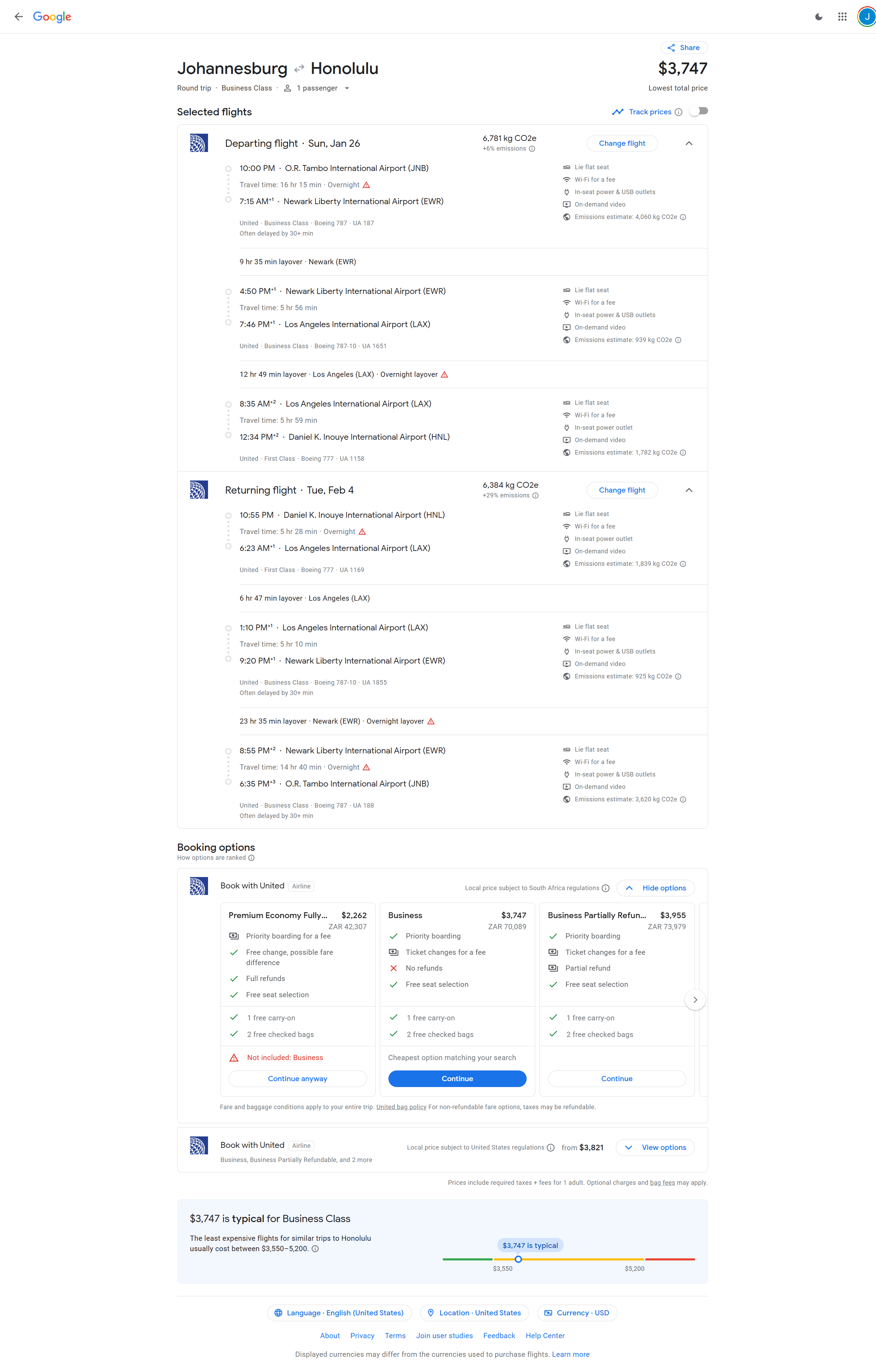 Jan 26, 2025 - Johannesburg, South Africa (JNB) to Honolulu, Hawaii, USA (HNL) - 70089 ZAR / $3747 USD Roundtrip