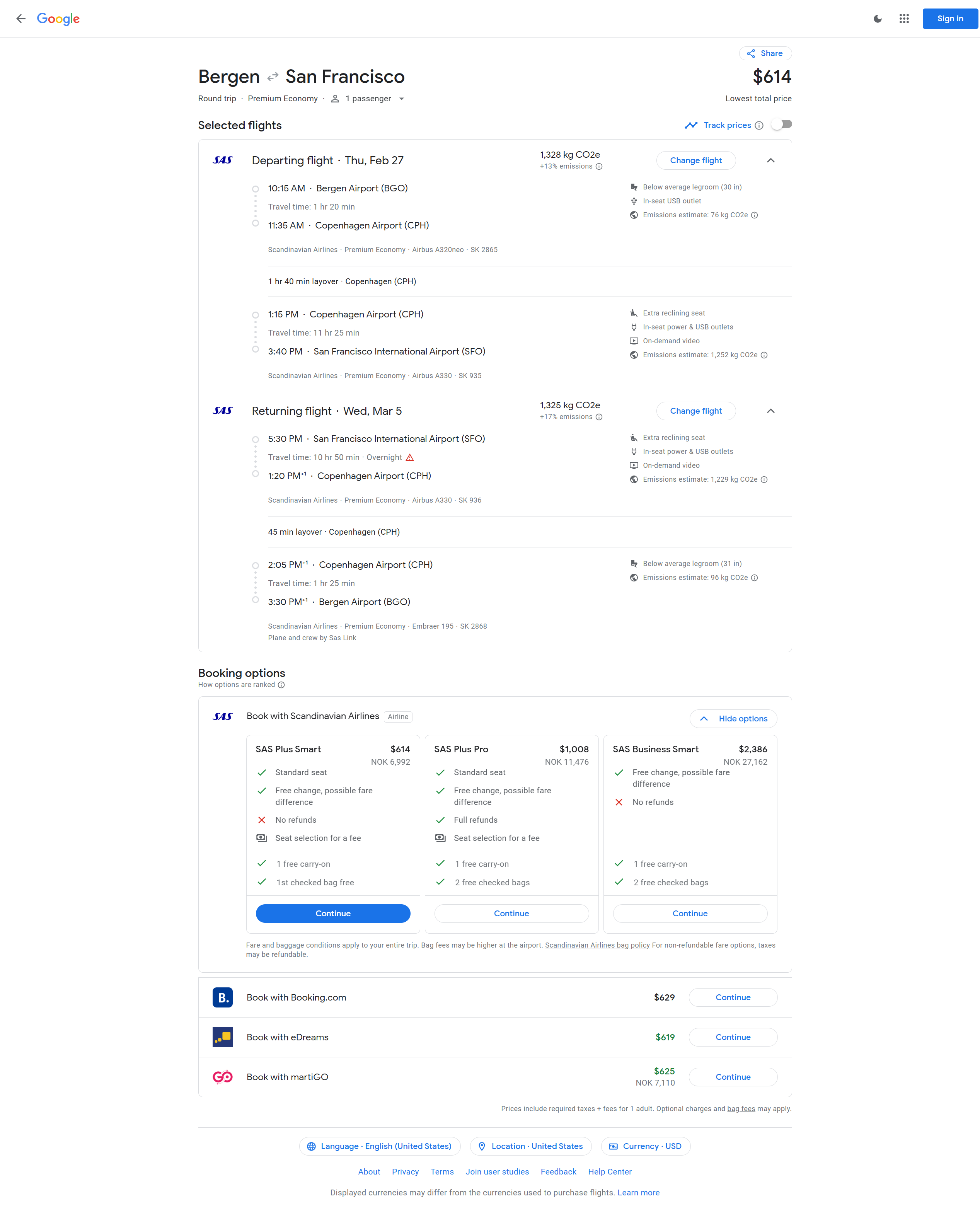 - Bergen (BGO) to San Francisco (SFO) - $614 r/t - https://www.google.com/travel/flights/s/XcGPvTr4GLAV3XhH9