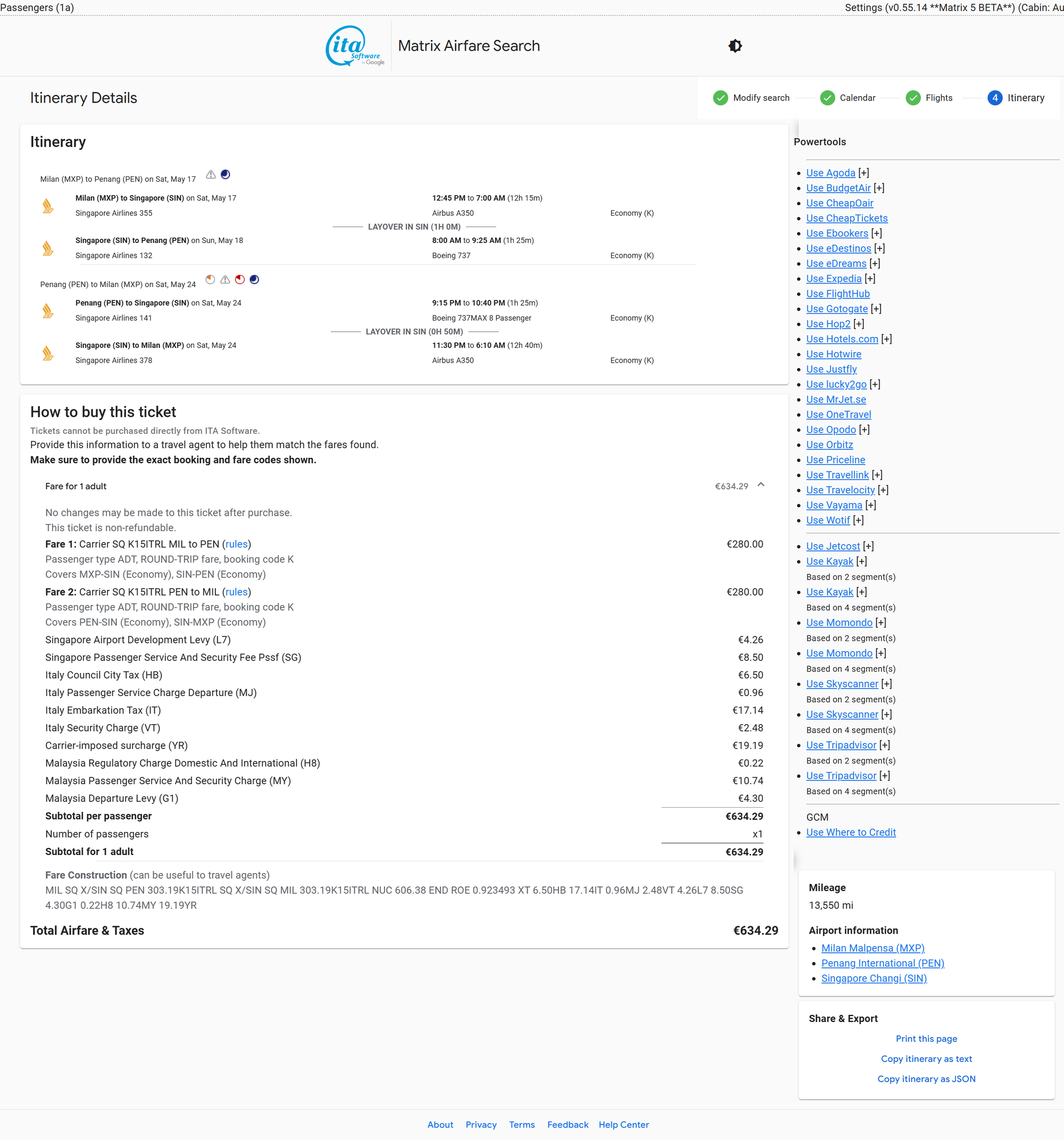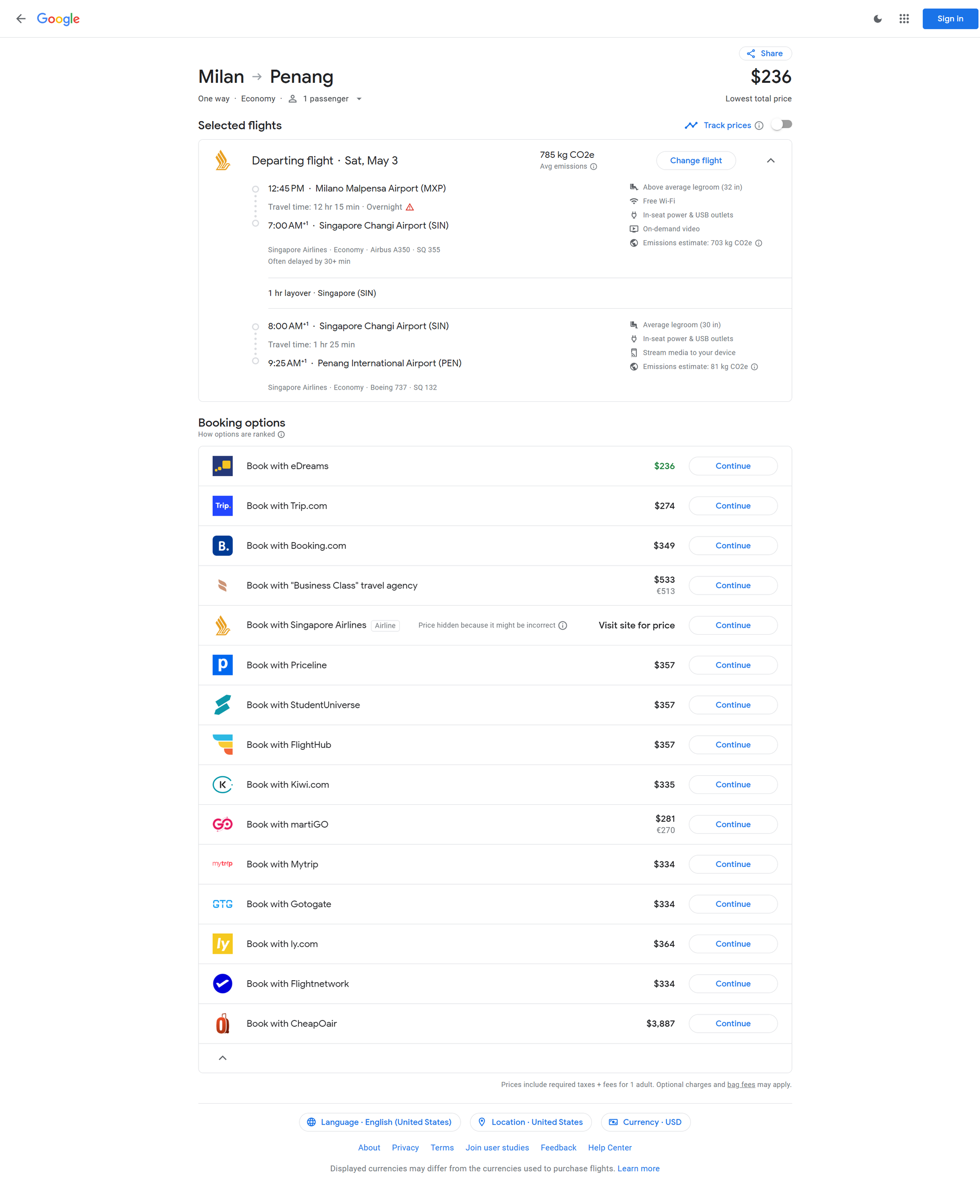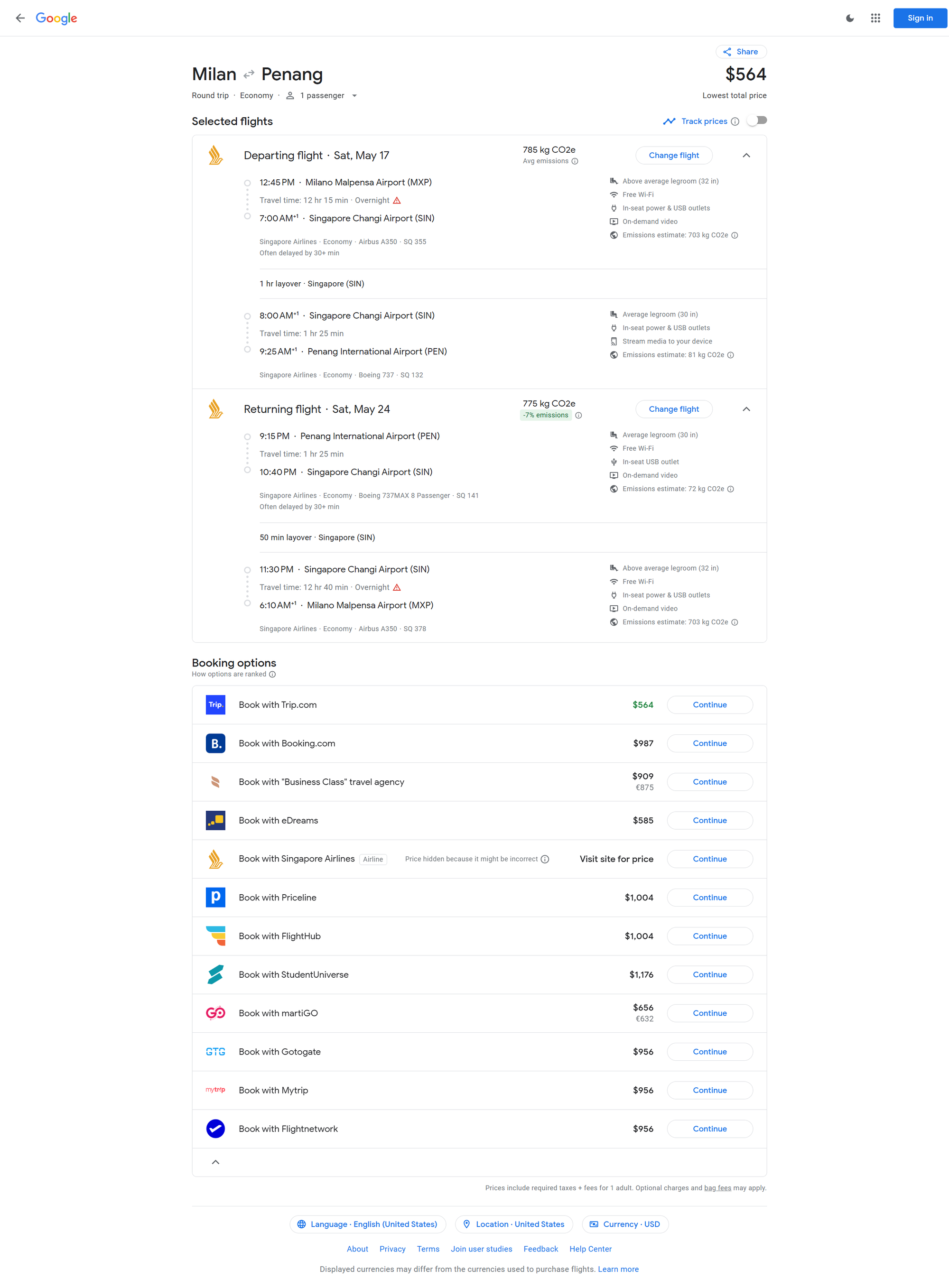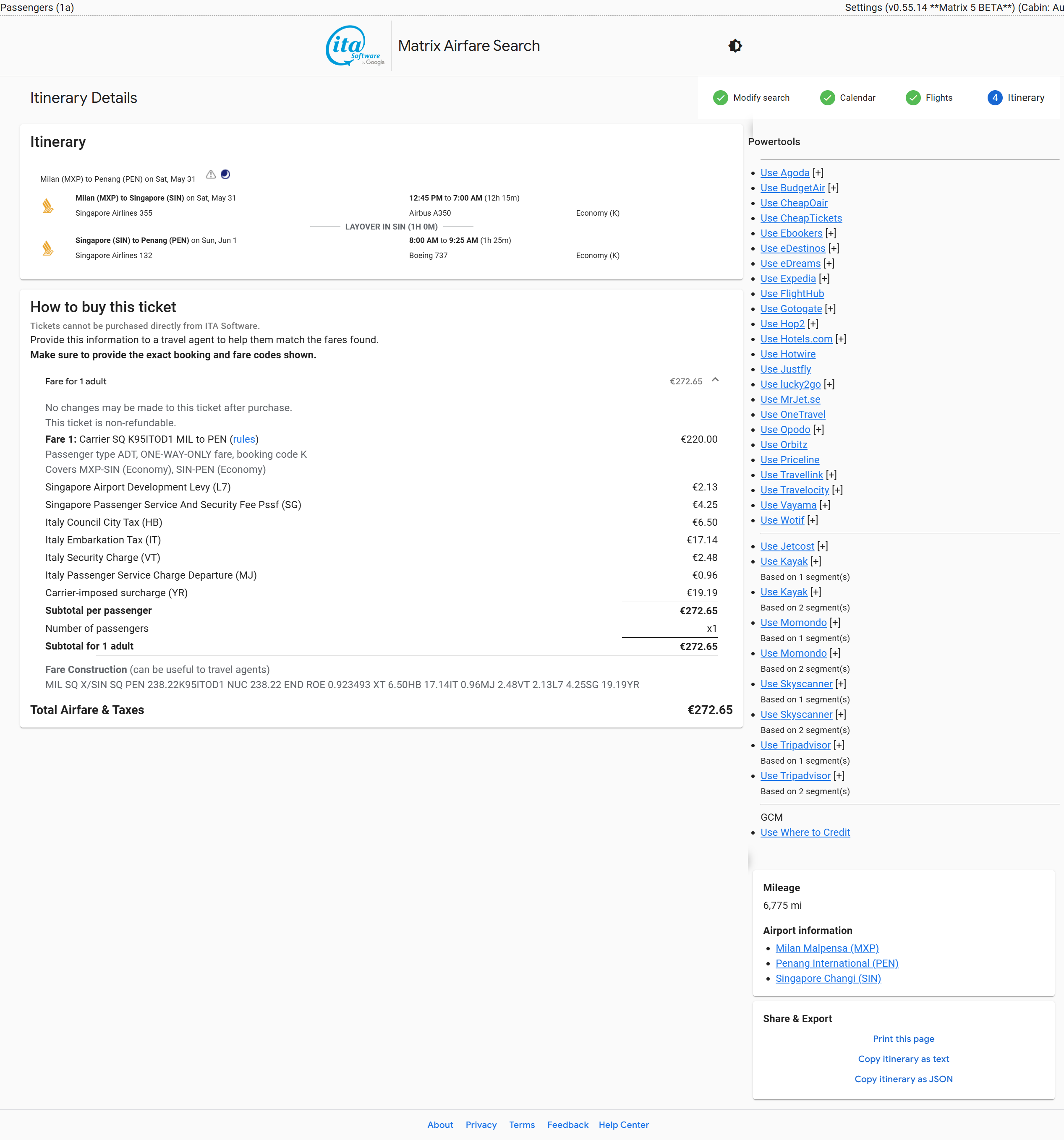 SQ - Milan (MXP) to Penang (PEN) - 270 EUR / $281 USD One-Way / 633 EUR / $658 Roundtrip - Economy