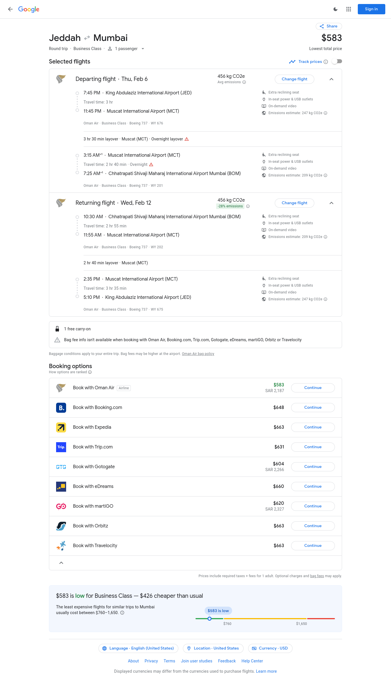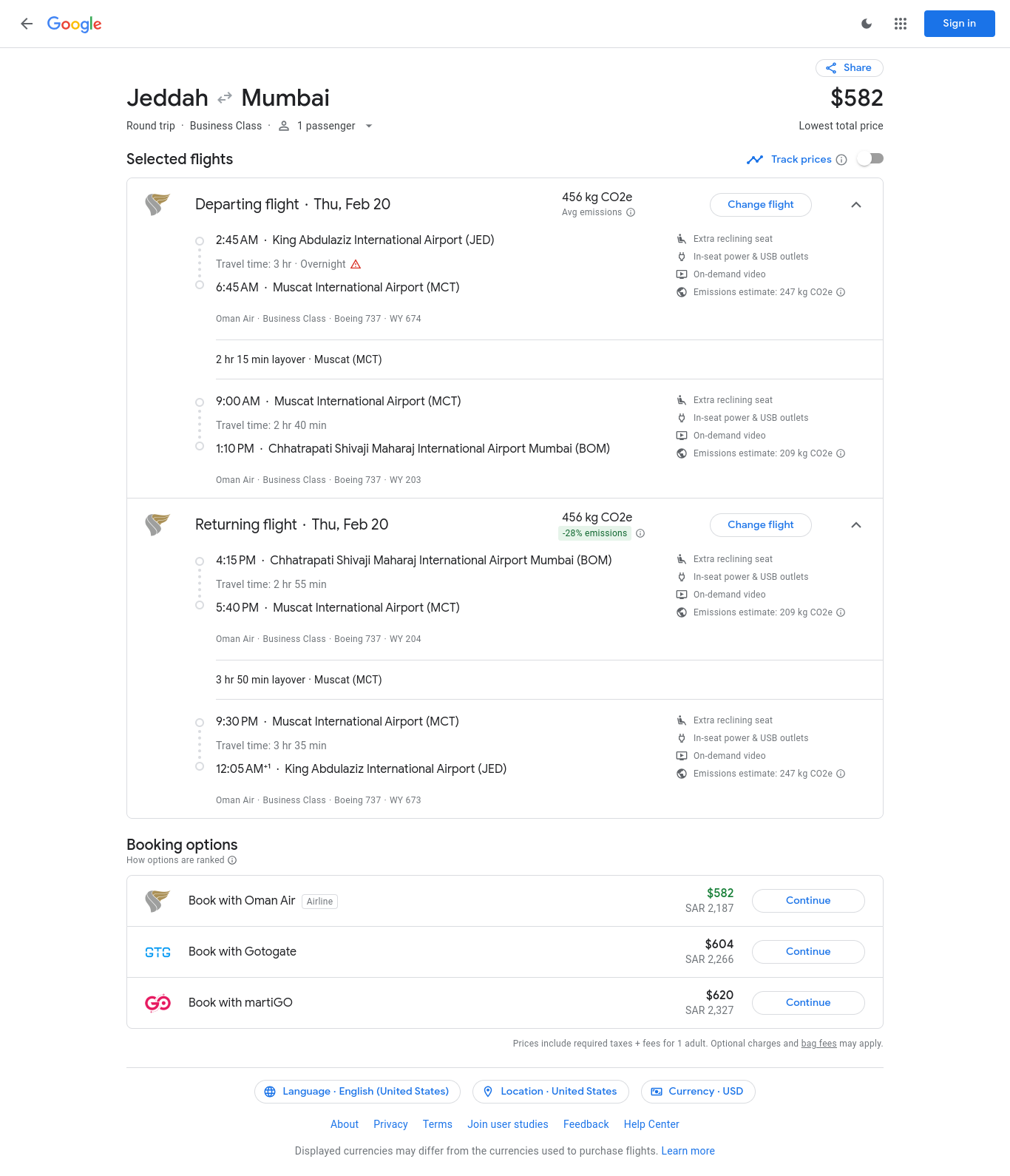 WY - Jeddah (JED) to Mumbai (BOM) - 2187 SAR / $582 USD Roundtrip