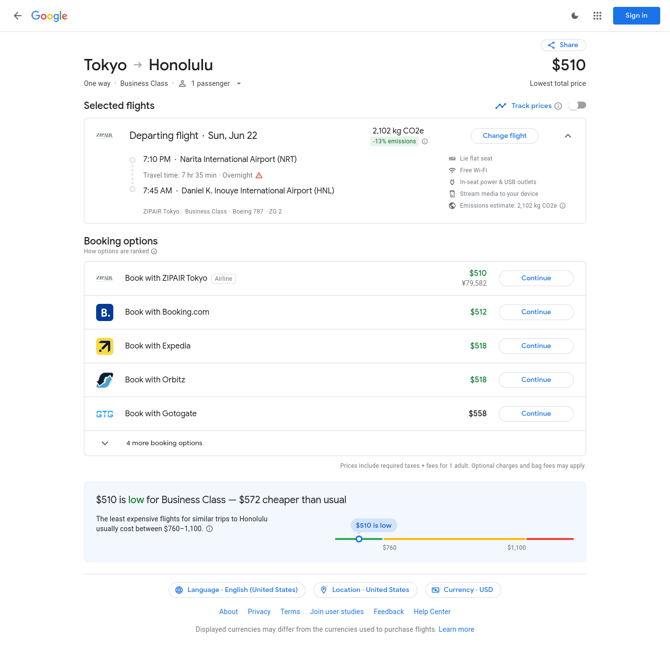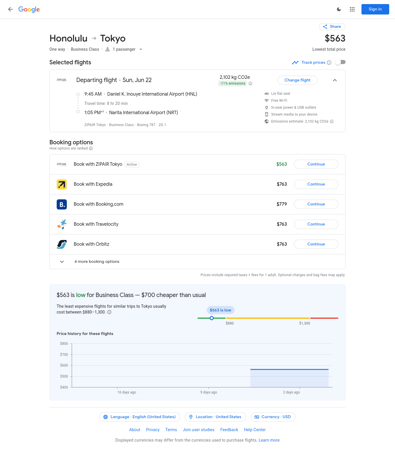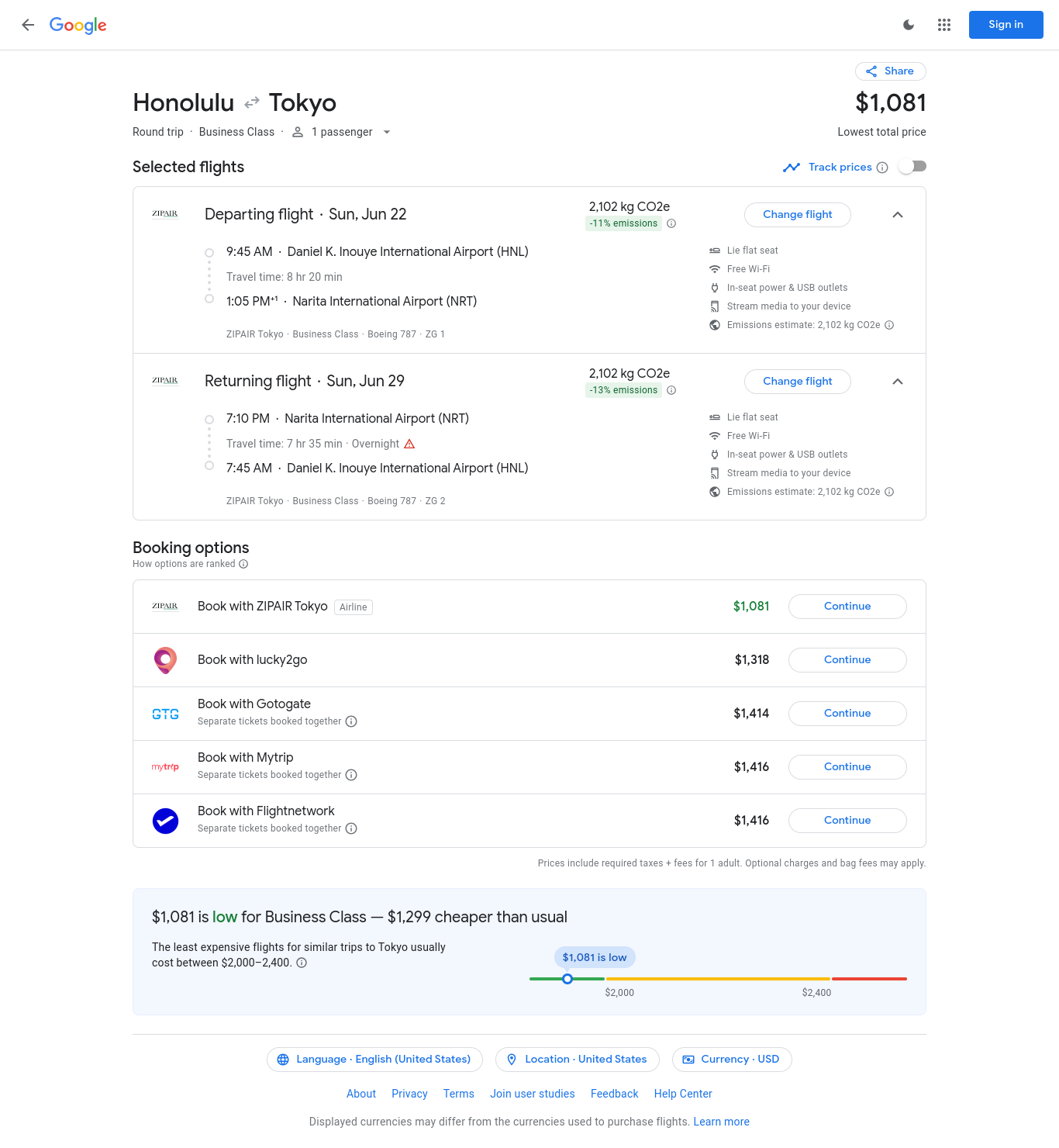 ZG - Honolulu (HNL) to Tokyo (NRT) - $1081 USD Roundtrip / $510 USD One-Way - Business